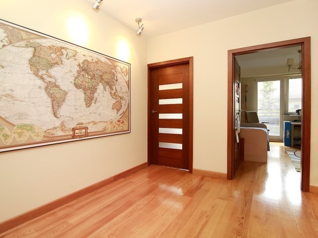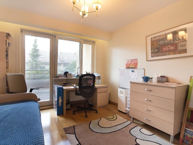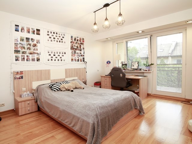 trzy pokoje – sypialnia o pow. 13,6m2 połączona z garderobą o pow. 5,7 m2; sypialnia o pow. 15,7 m2 z zabudowaną szafą wnękową z wyjściem na balkon oraz sypialnia o pow. 13,6 m2 z szafą i wyjściem na balkon. Na podłodze wszystkich pokoi parkiet jesionowy. Duża łazienka z oknem o pow. 10 m2 wyposażona jest w przestronną kabinę prysznicową, toaletę, bidet i dużą ilość zamykanych szafek.