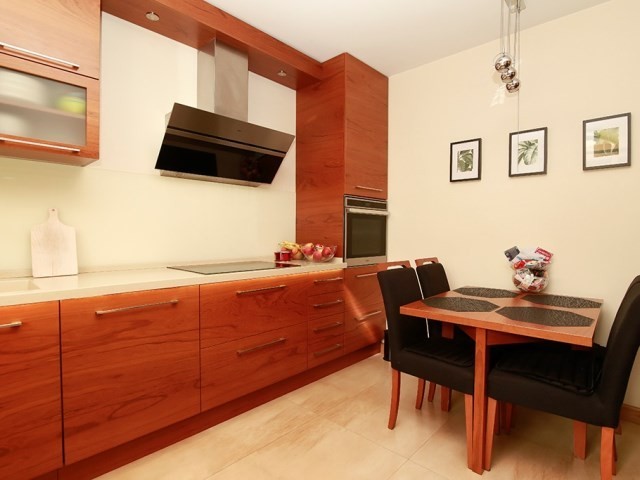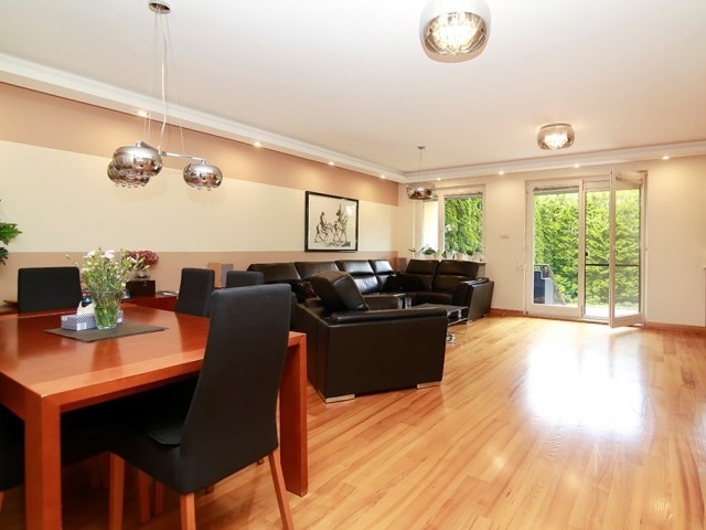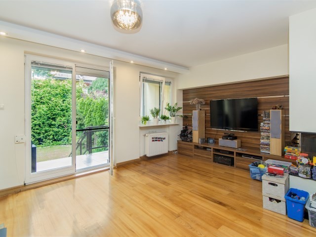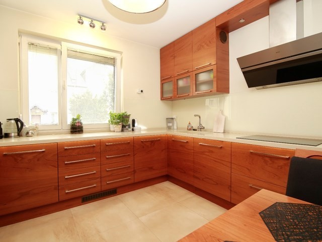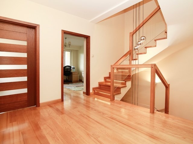 Na podłodze położono jesionowy parkiet . Wygodne schody prowadzące na wyższe kondygnacje wykonane są z tego samego drewna. W pełni wyposażona kuchnia z dużą ilością blatu roboczego jest idealnym miejscem do przygotowywania posiłków. Całość prezentuje się elegancko i zaprasza do natychmiastowego wprowadzenia. Z przestronnego salonu z kominkiem jest wyjcie na taras z zejściem do ogródka obsadzonego wysokimi tujami zapewniającymi prywatność.