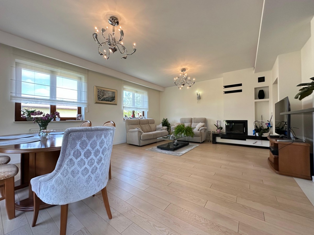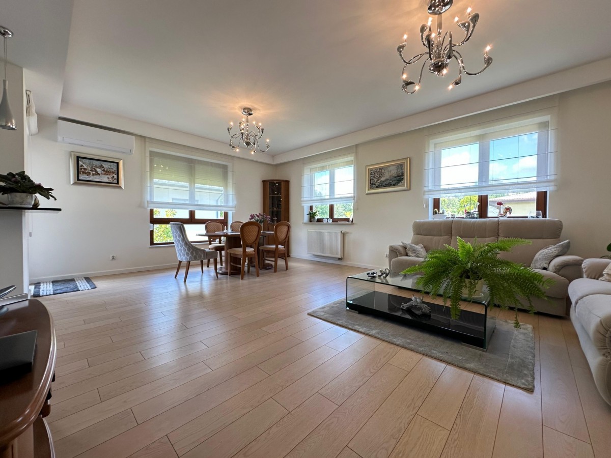 Wysoki standard: drewniane okna i drzwi, deska dębowa bielona w salonie, belgijskie panele w sypialniach, spieki kwarcowe, LED-owe oświetlenie schodowe, klimatyzacja split.