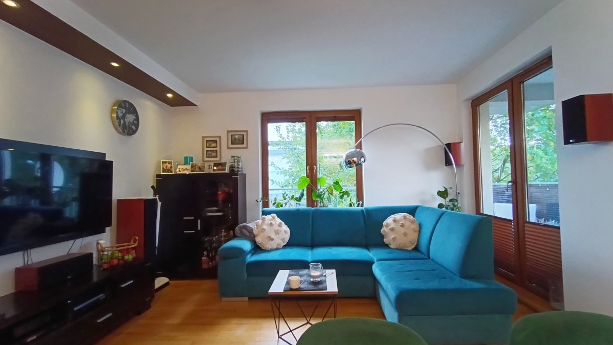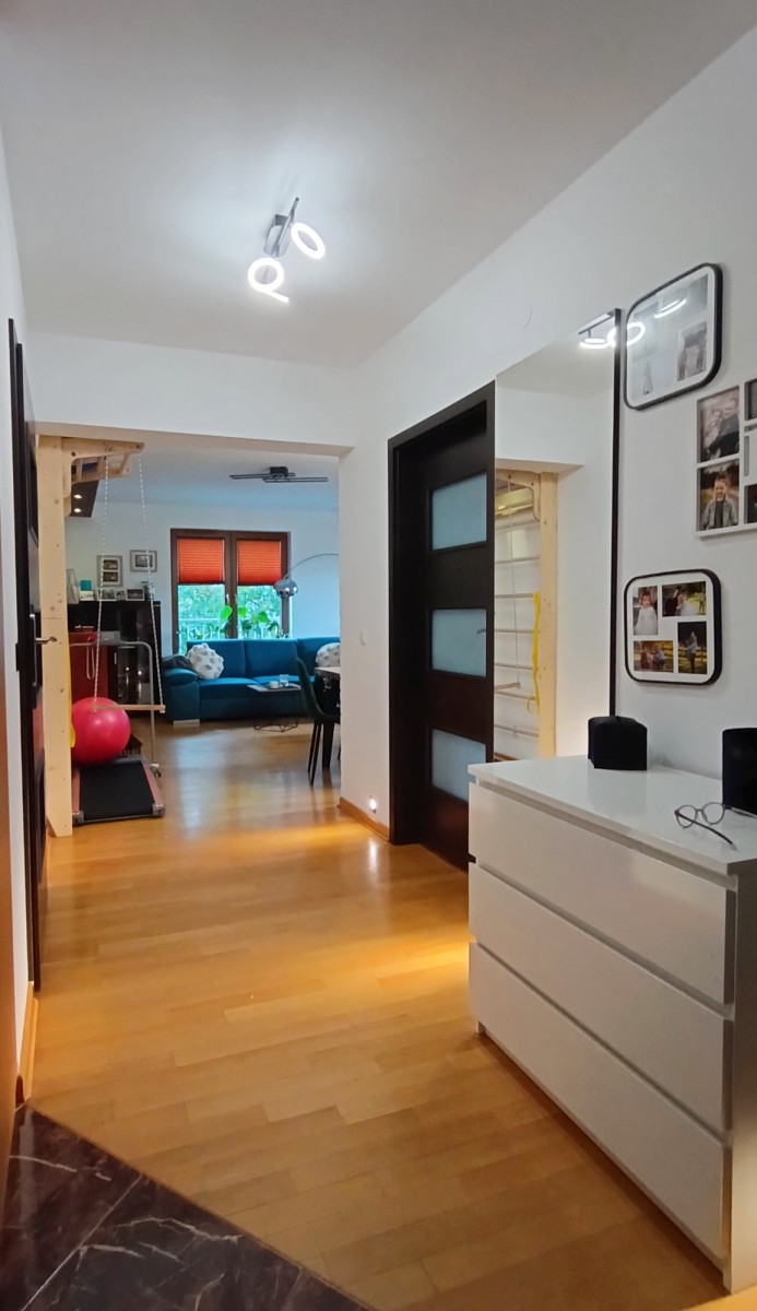 Znakomite mieszkanie dla rodziny. Dwie sypialnie, duży salon z wyjściem na loggię połączoną z balkonem i dwie łazienki (obecnie jedna wykorzystywana jako pralnio-suszarnia/skład). Balkon i okna mieszkania wychodzą na zieloną i cichą ulicę Mazowiecką.