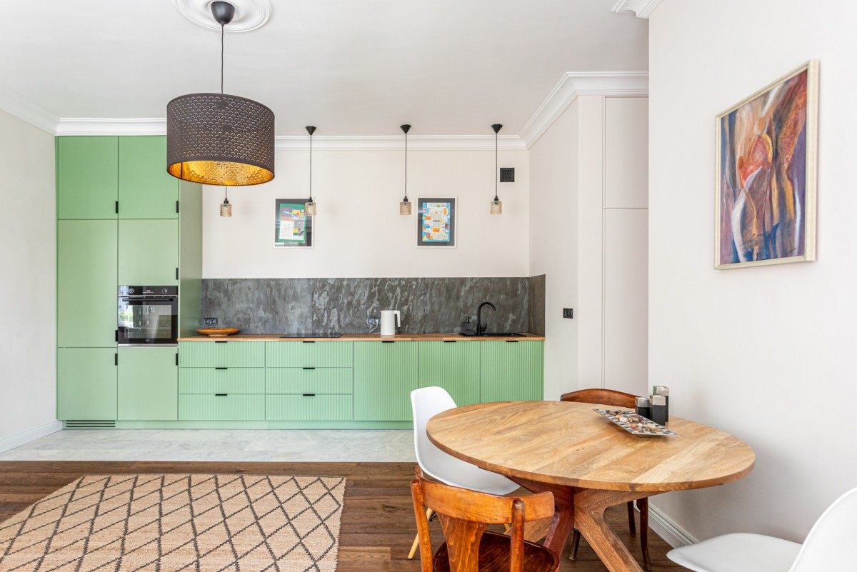 - Salon z otwartą kuchnią – 29,4 m² Jasne, przestronne wnętrze z nowym sprzętem AGD, dużym blatem roboczym i pojemnymi szafkami.