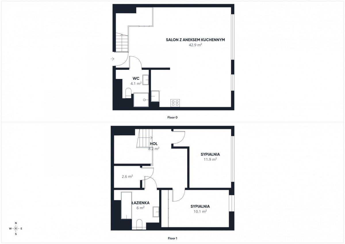 Dwupoziomowy układ zapewnia wyraźny podział na strefę dzienną i prywatną, zwiększając komfort codziennego życia.