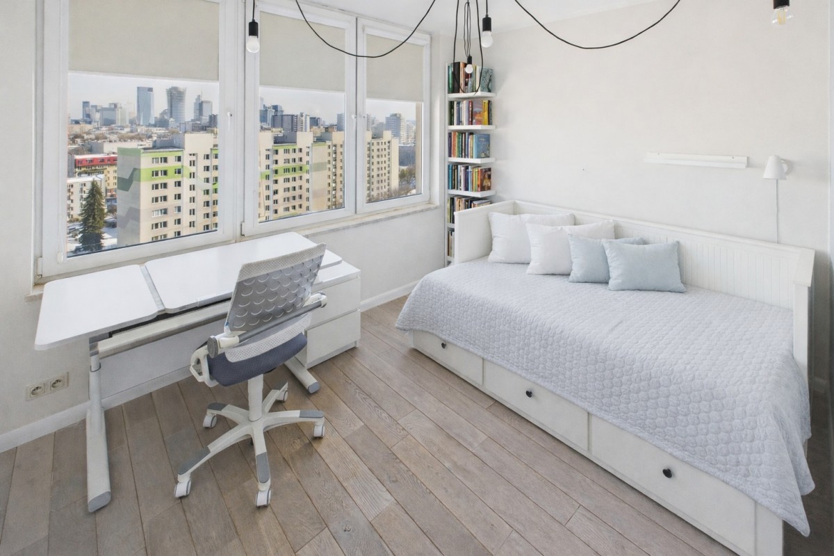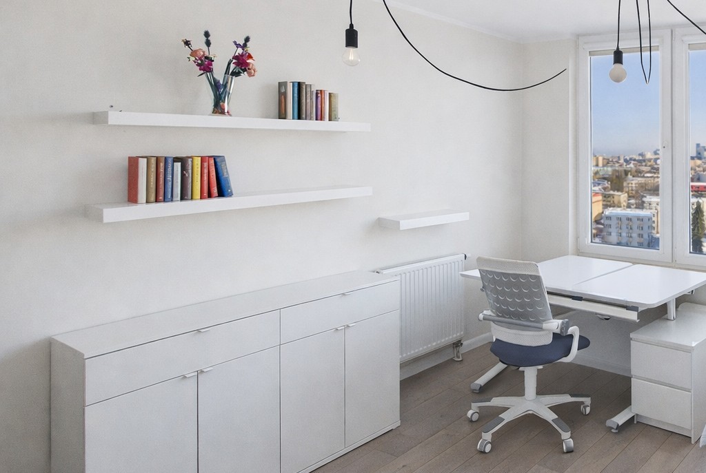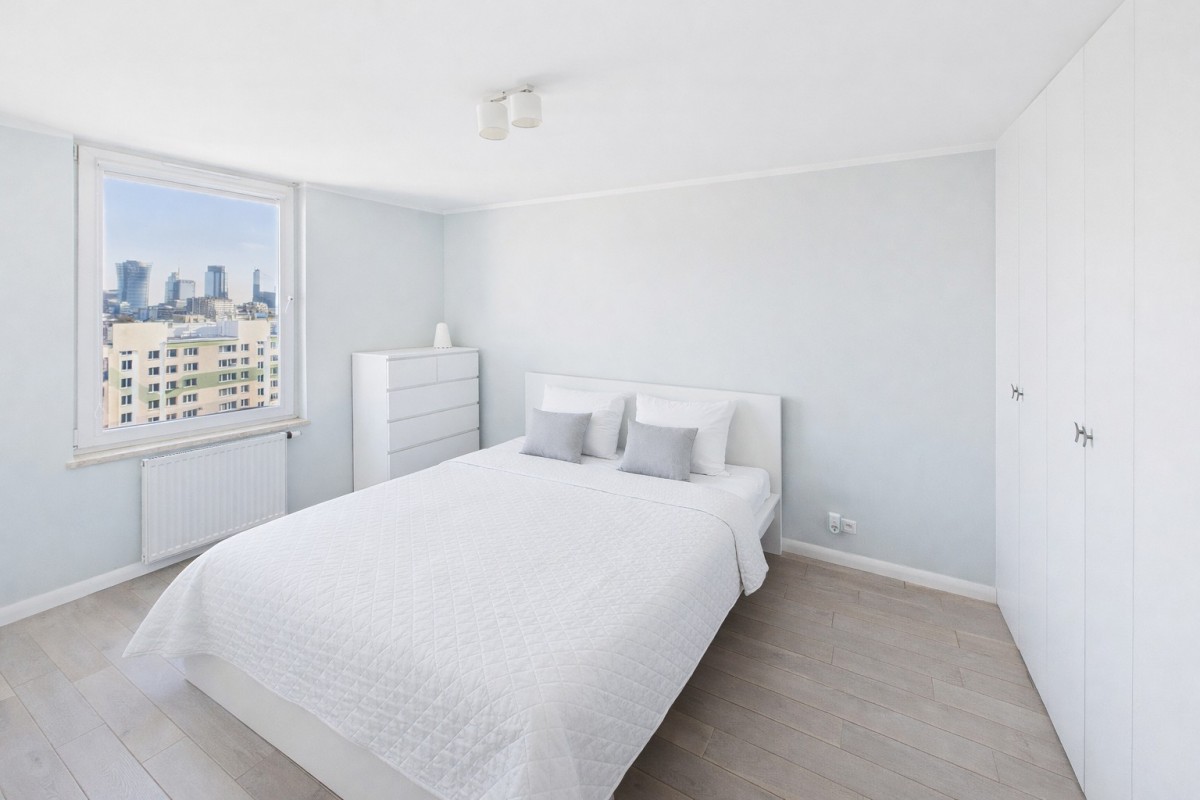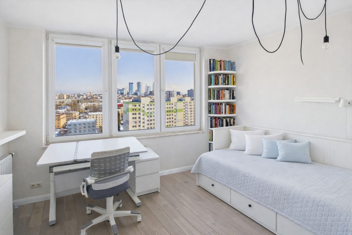 Mieszkanie wyróżnia się funkcjonalnym układem, bardzo dobrym doświetleniem oraz otwartą panoramą Warszawy widoczną z okien, zapewniającą poczucie przestrzeni i prywatności niedostępne na niższych kondygnacjach.
