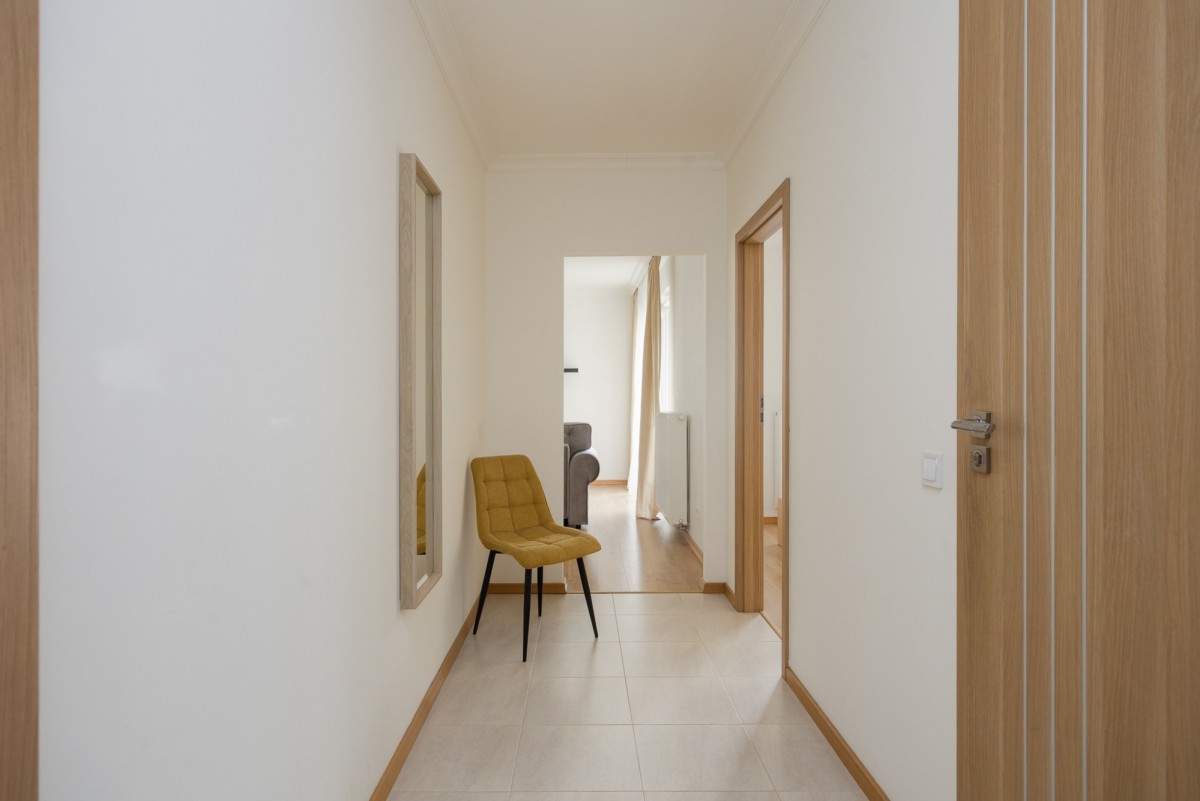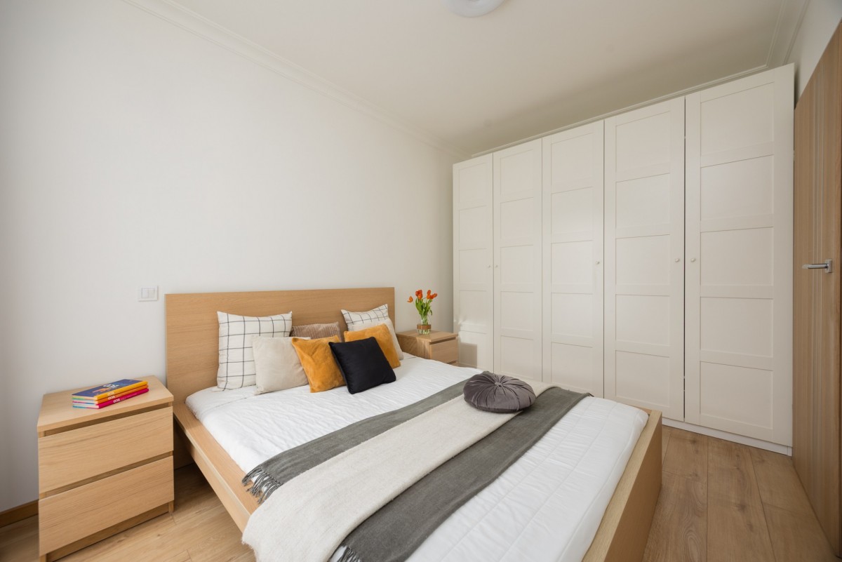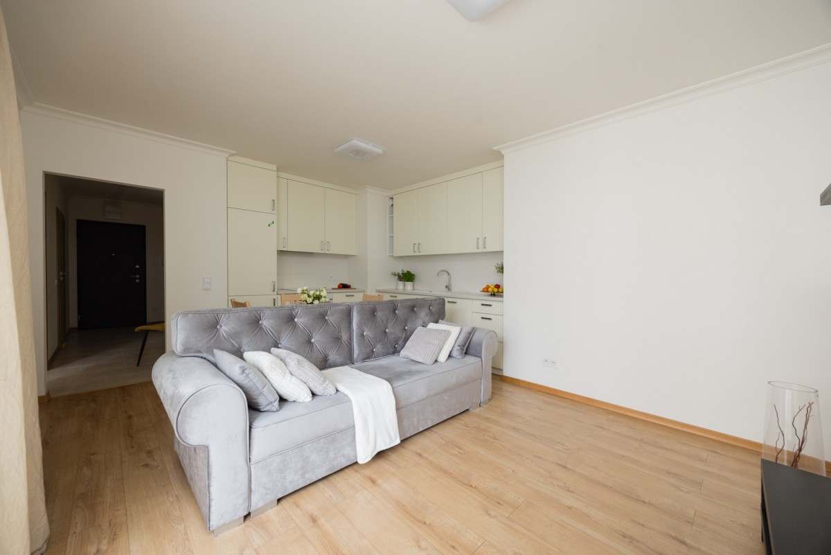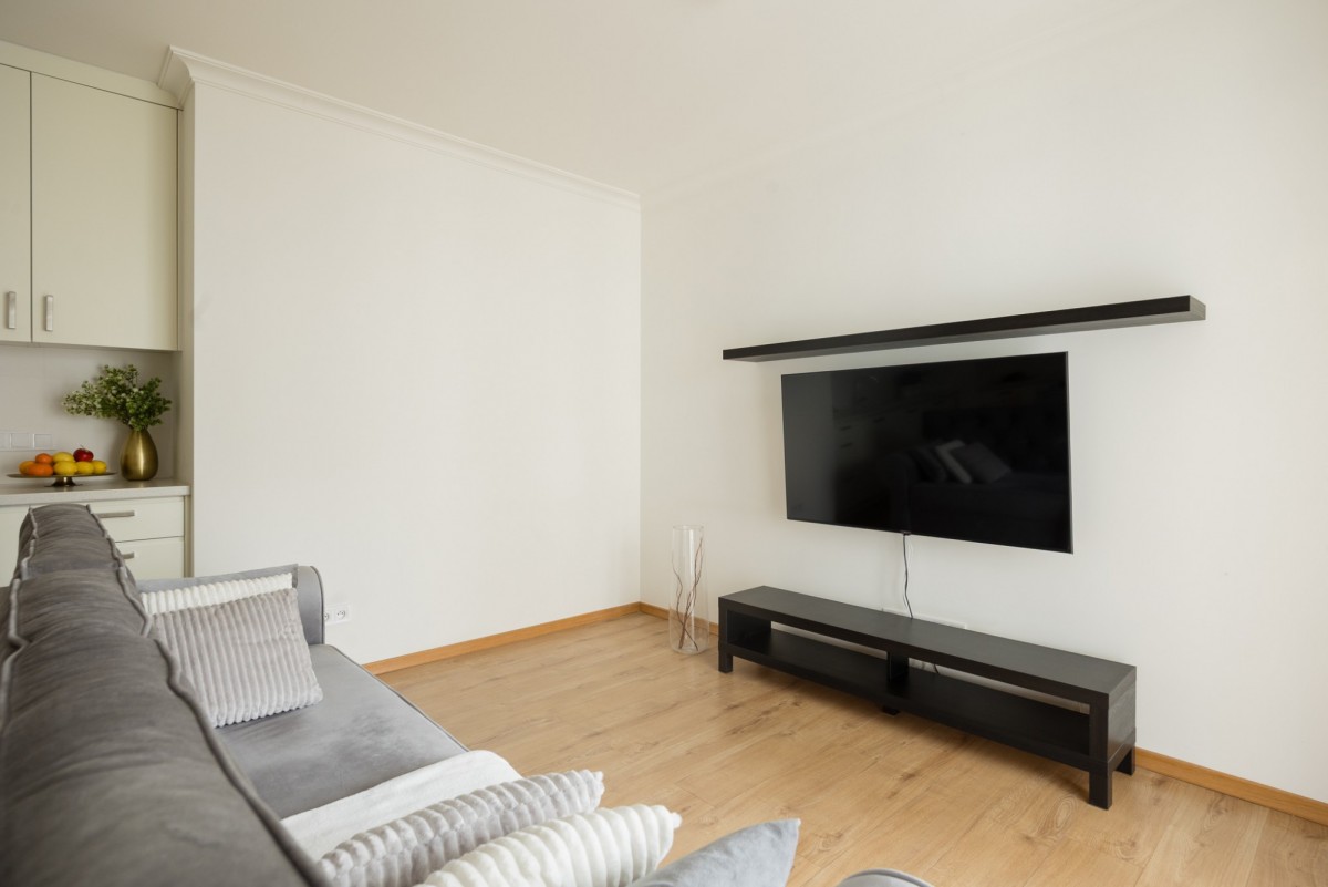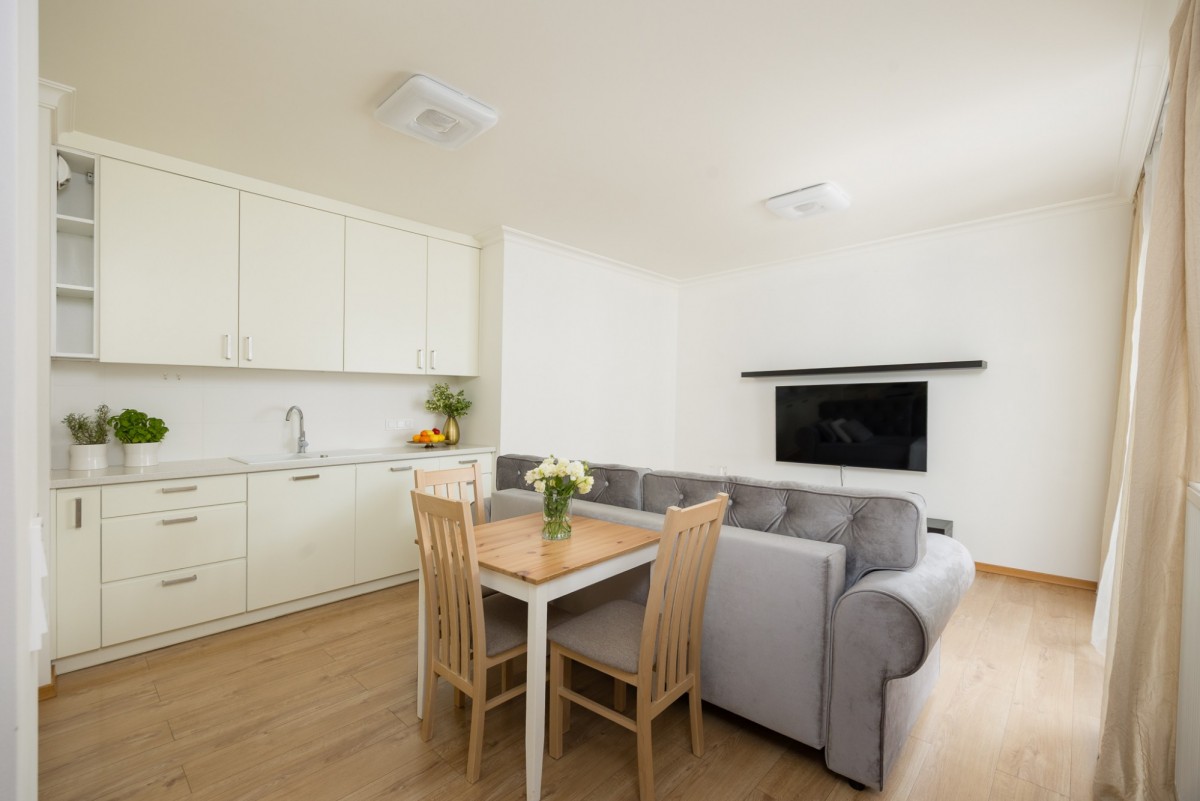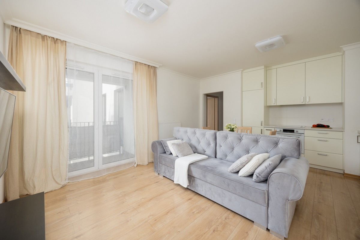 Jasne i słoneczne, wykończone w nowoczesnym standardzie, w pełni wyposażone 2-pokojowe mieszkanie Rozkład i wyposażenie: – salon jasny i słoneczny z wygodną sofą, stołem jadalnianym, komodą, TV;