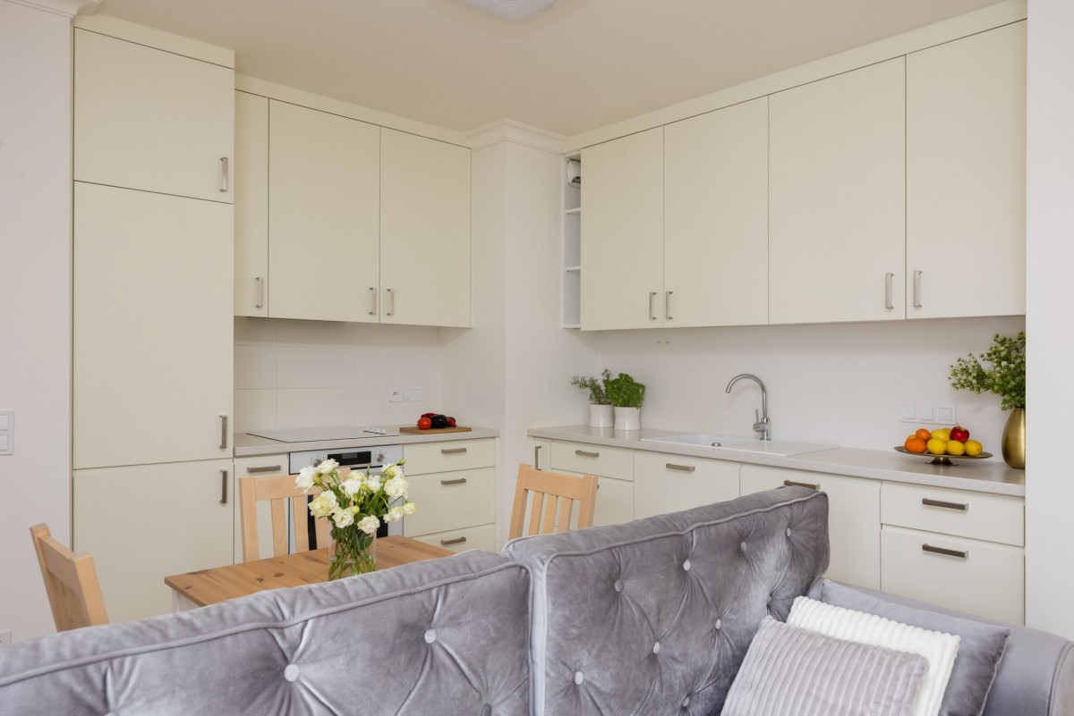 – kuchnia w pełnej zabudowie otwarta na salon wyposażona we wszystkie sprzęty AGD: duża lodówka z zamrażarką, piekarnik i płyta indukcyjna, zmywarka, okap;