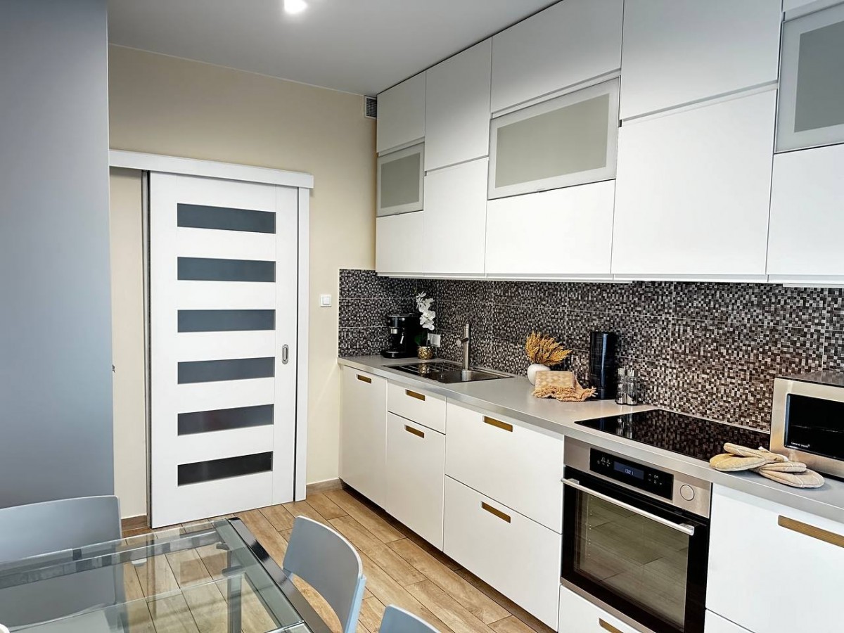 – Kuchnia: Oddzielna, w pełni wyposażona w wysokiej jakości sprzęty AGD, w tym zmywarkę, lodówkę, piekarnik oraz płytę indukcyjną. Nowoczesne meble i funkcjonalny układ zapewniają wygodę podczas codziennego gotowania.