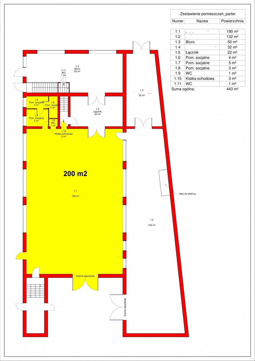W skład lokalu wchodzą 2 duże sale – 195m2 i 185 m2 / wysokość ponad 3.4m , biuro, 3 toalety, komunikacja, pomieszczenia socjalne i piwnice.