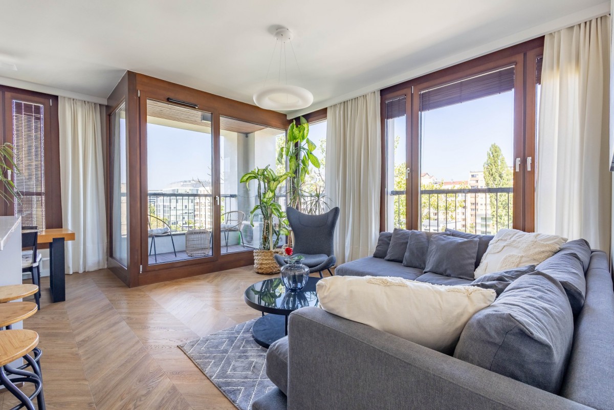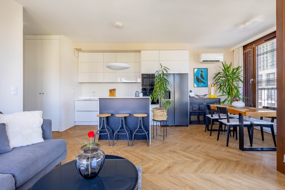 Apartament zlokalizowany jest na 5. piętrze nowoczesnego zadbanego i strzeżonego budynku z 2019 roku. Lokal jest jasny i przestronny, doświetlony dużymi, wysokimi oknami co sprawia że przestrzeń wydaję się być jeszcze większa.
