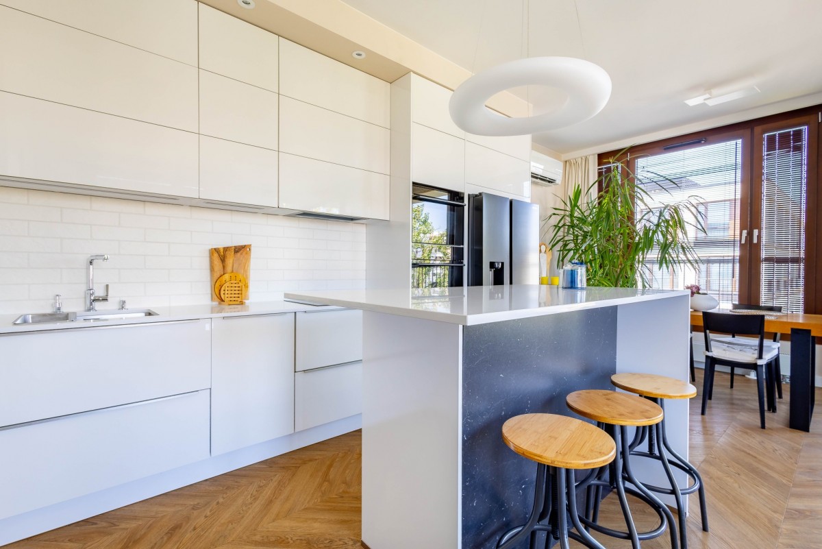 – doskonale wkomponowanego i pełni wyposażonego aneksu kuchennego z wyspą