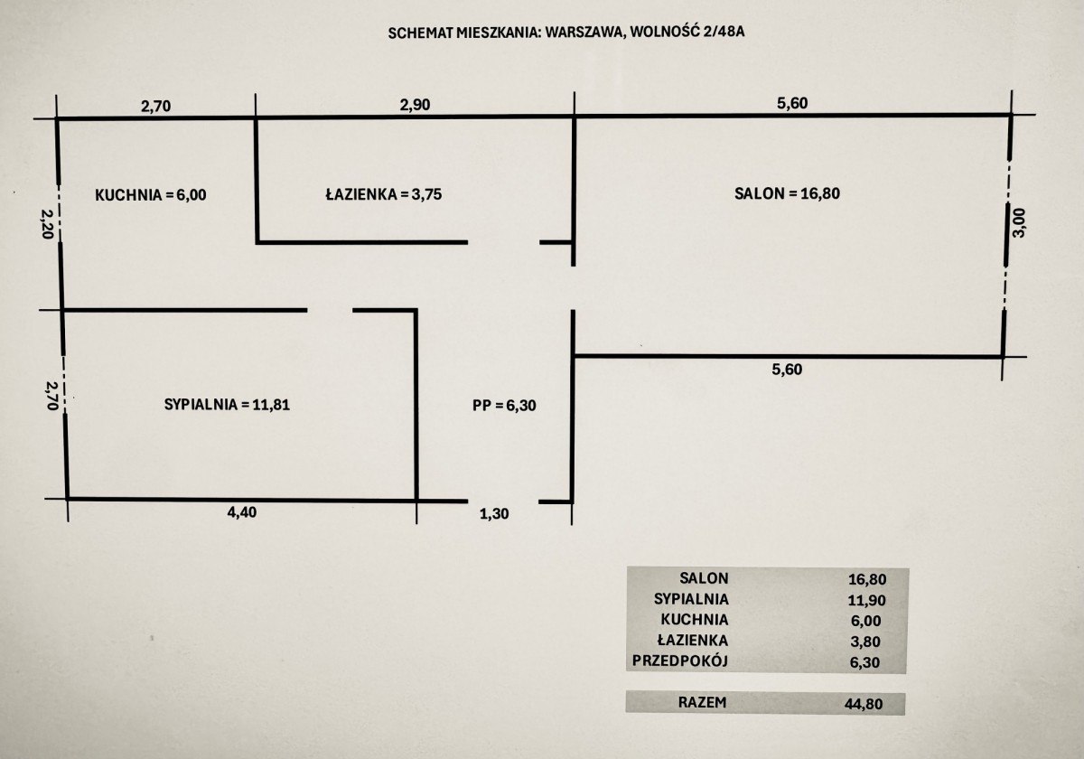 Obmiar powierzchni całego mieszkania przy podłodze to 44,80 mkw; wysokość pomieszczeń od 1,92 do 3,00m.