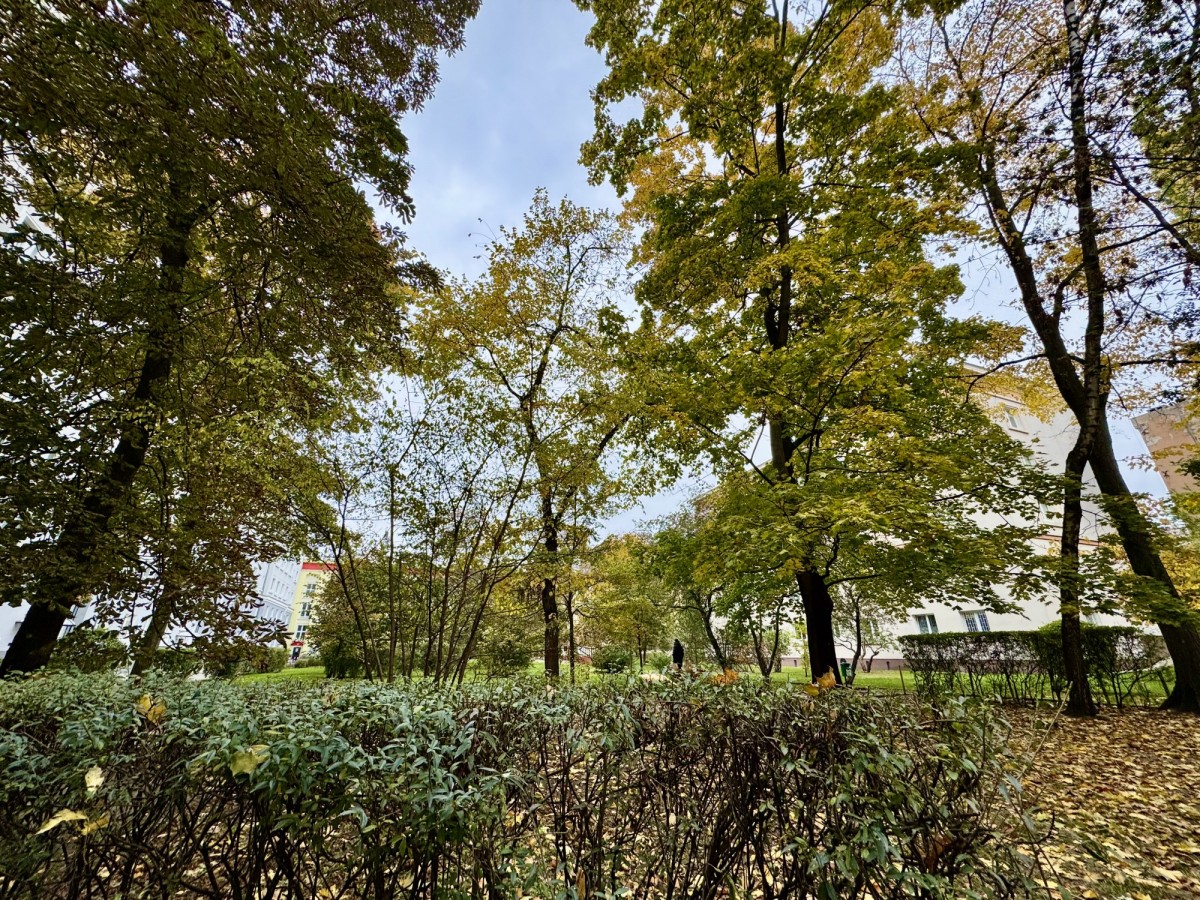 Ulica z niewielkim natężeniem ruchu, a podwórko duże zielone ze starodrzewiem.