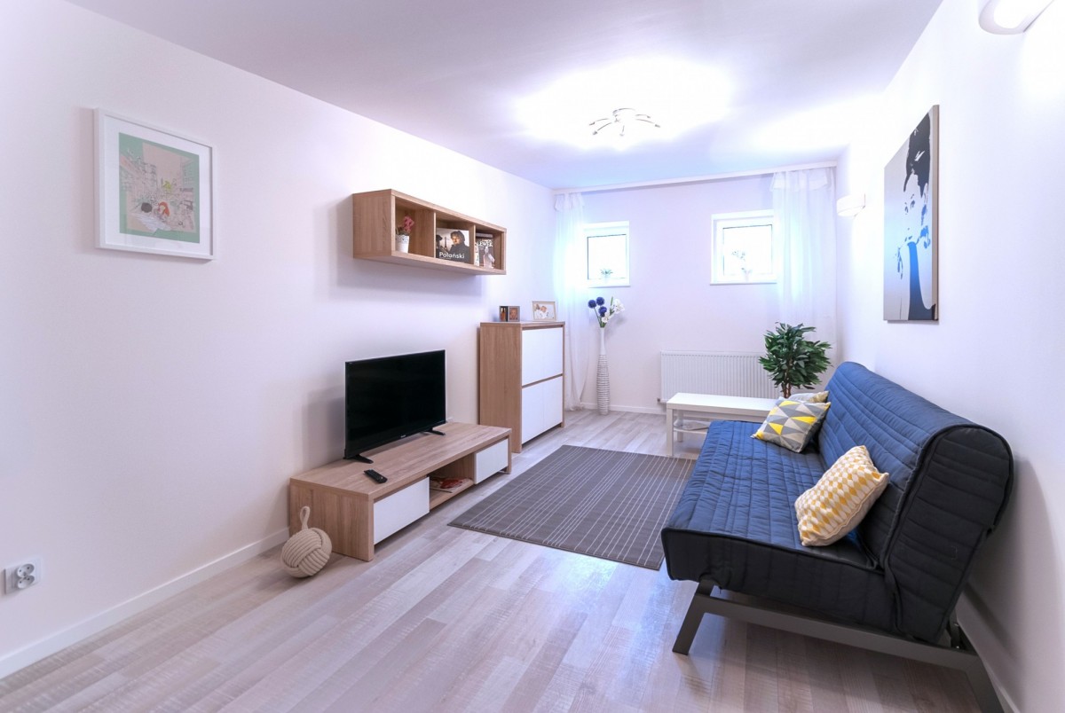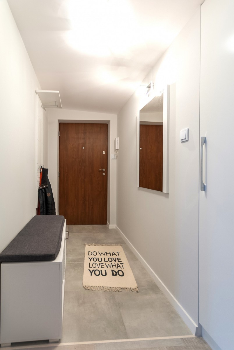 Mieszkanie po generalnym remoncie wykończone w stylu nowocześnie minimalistycznym; dominuje jasny kolor.
