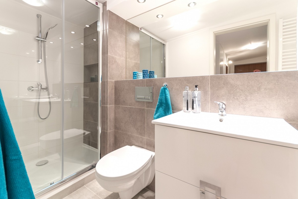 Łazienka (3,75 mkw) z dużym podwójnym prysznicem, dużym lustrem i wydajnym oświetleniem; dodatkowo pralka.