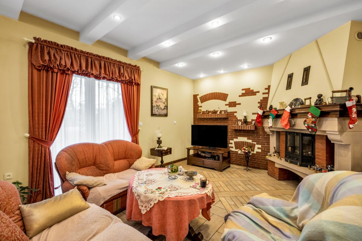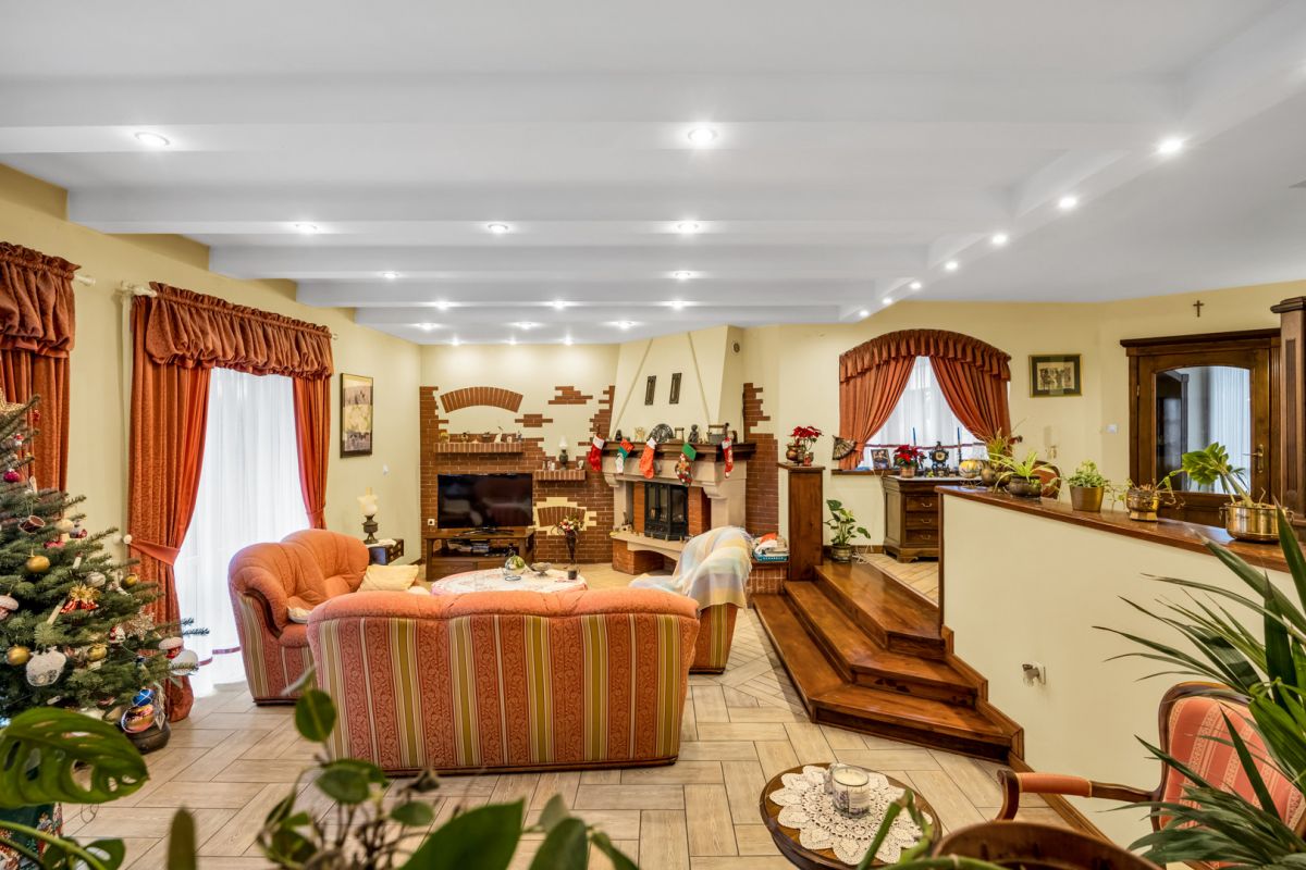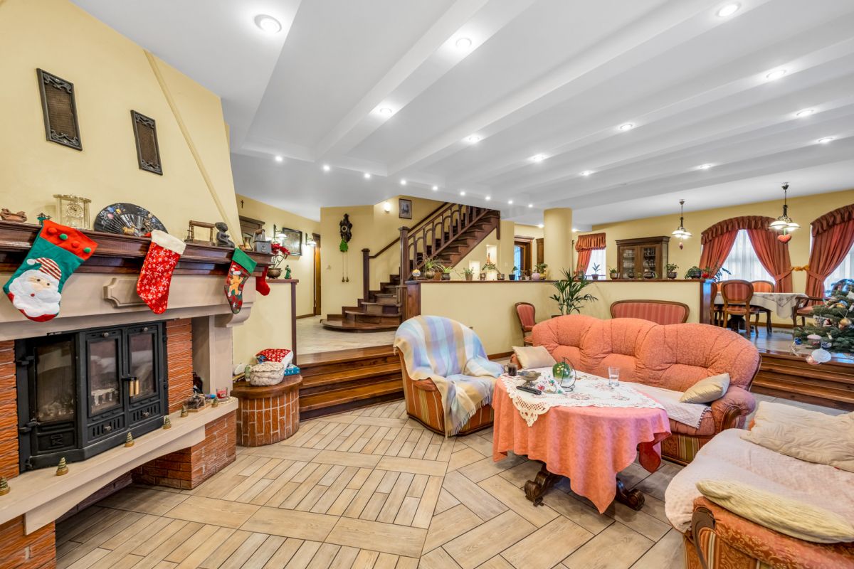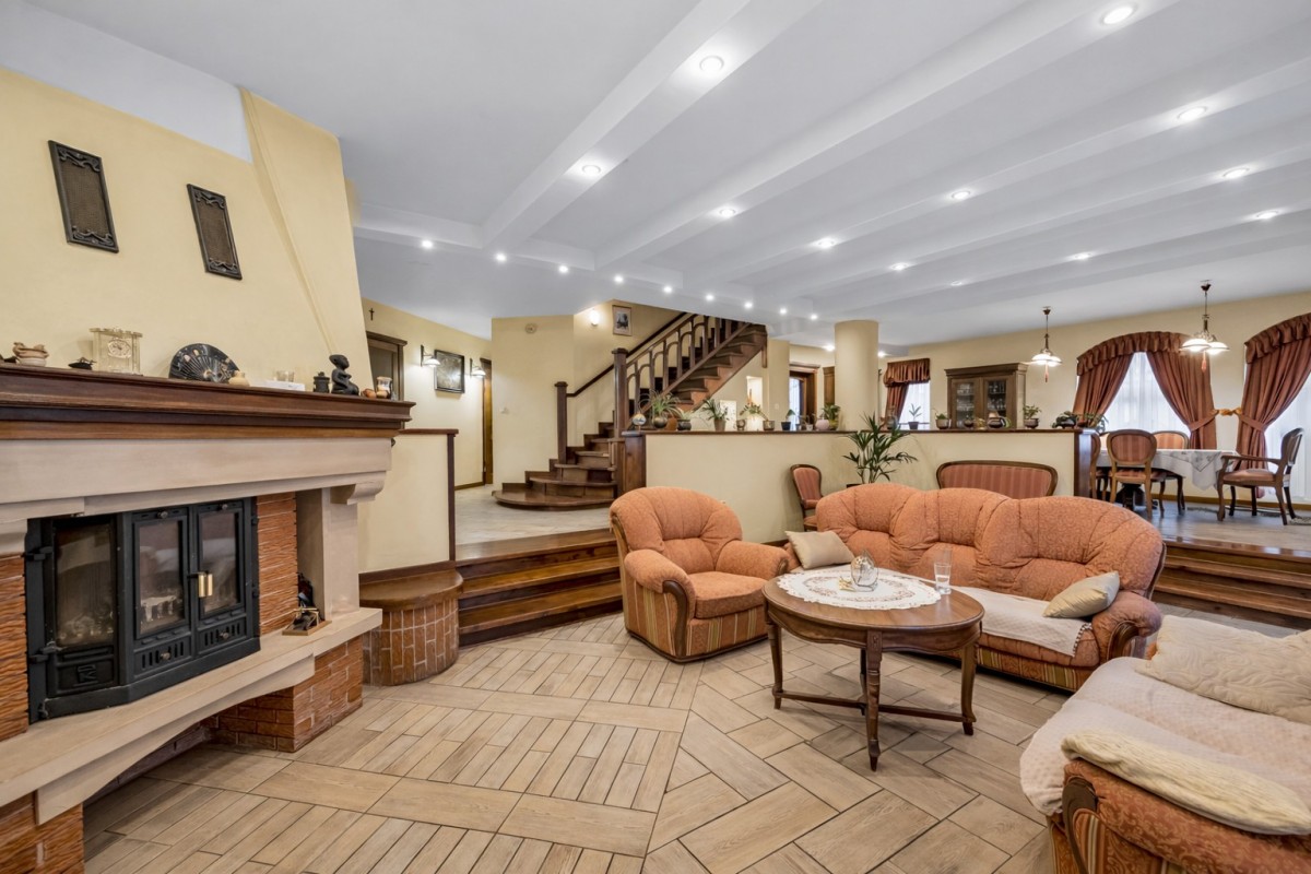 – Przestronny salon z kominkiem z wyjściem na taras, drewniany parkiet i terakota [29 m²]