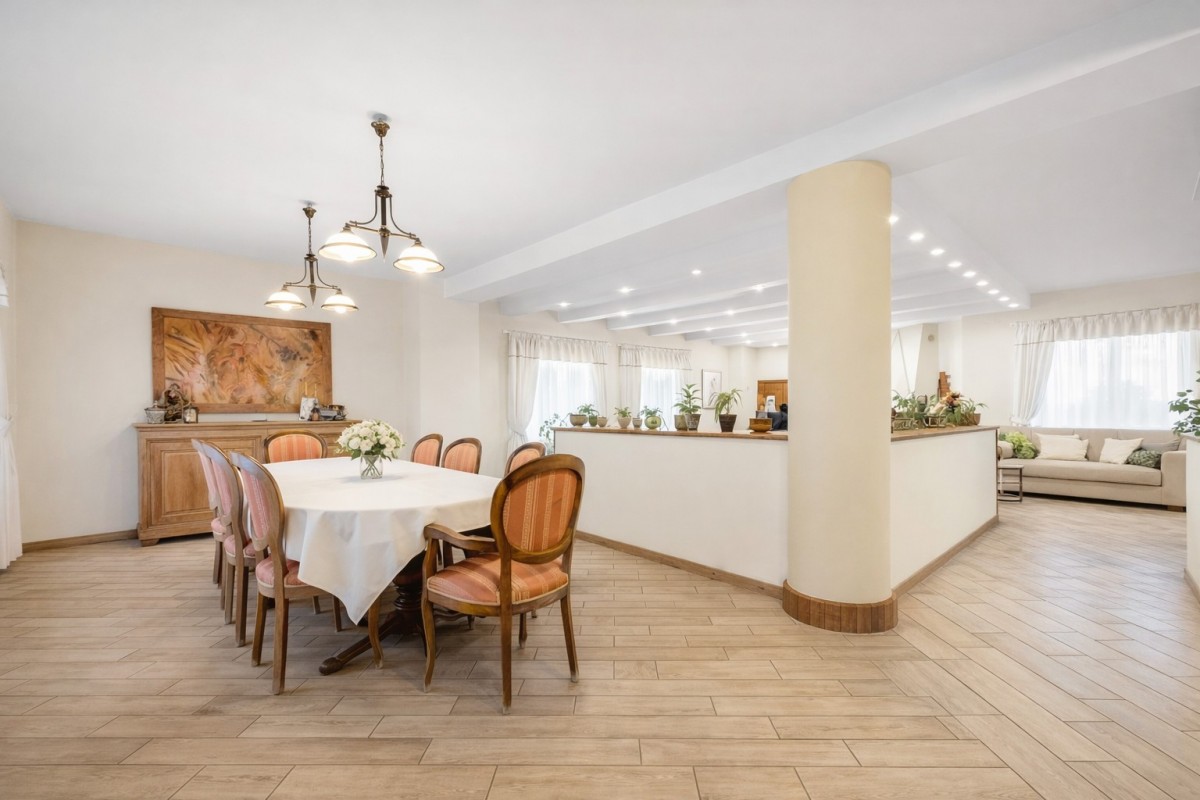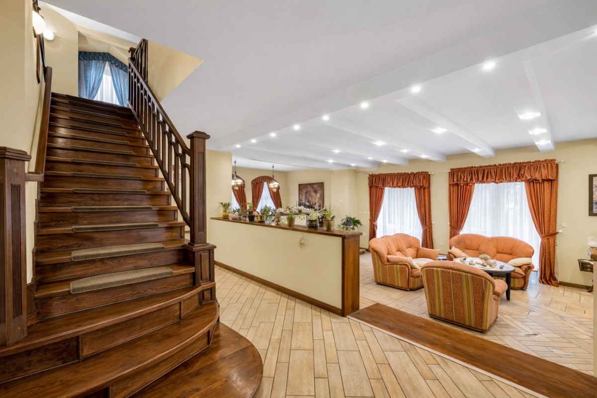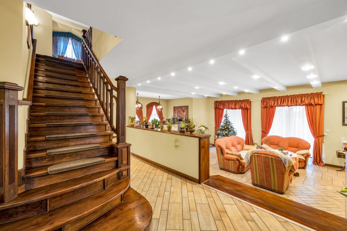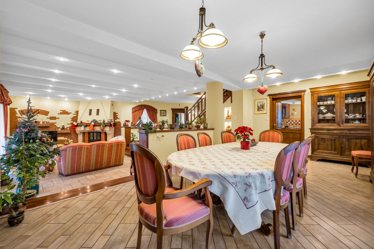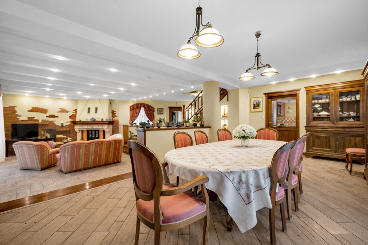 – Przestronny salon z kominkiem z wyjściem na taras, drewniany parkiet i terakota [29 m²]