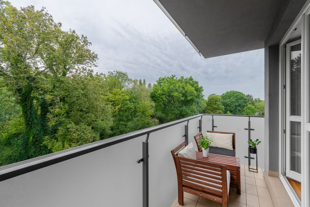 Mocnym punktem mieszkania jest balkon z widokiem na zieleń i tor wyścigów na Służewcu – taki widok to prawdziwa rzadkość w Warszawie.