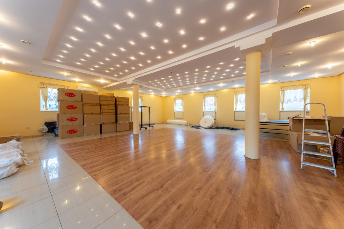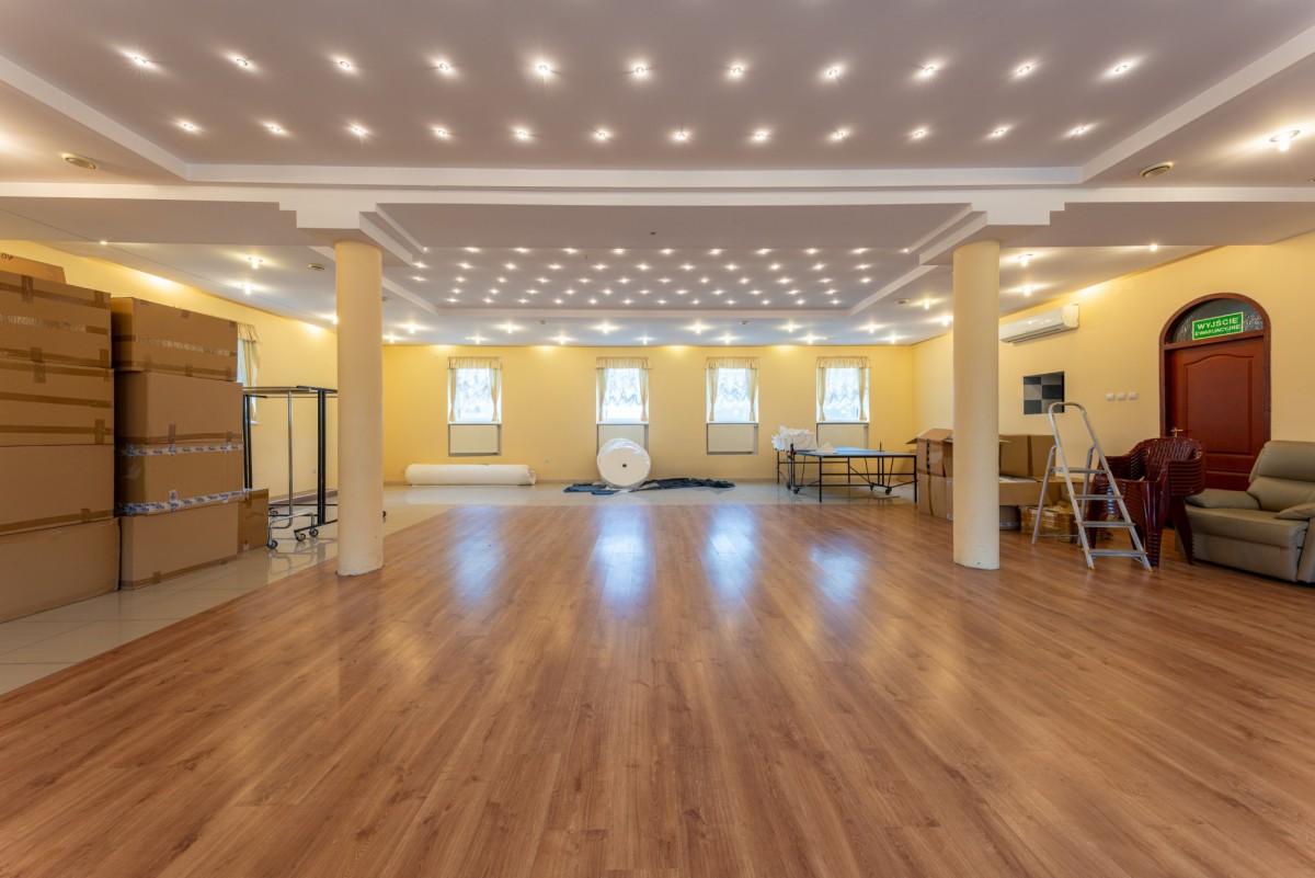 Parter – wcześniej funkcjonowała tu sala bankietowa z zapleczem gastronomicznym na około 100 miejsc konsumpcyjnych. Przestrzeń idealnie nadaje się na restaurację, salę eventową, klub fitness, hurtownię lub warsztat usługowy.