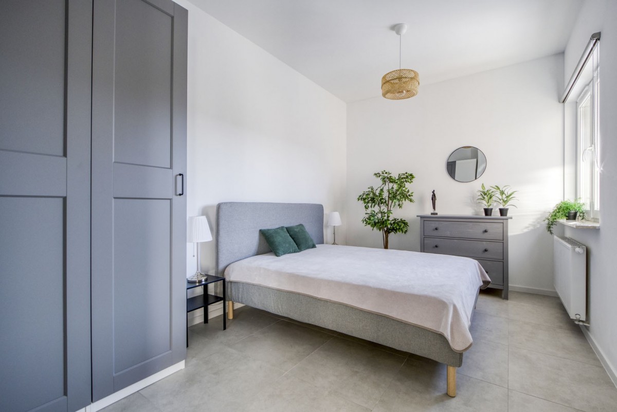 Mieszkanie o powierzchni 46 mkw, składa się z pokoju dziennego z aneksem kuchennym, sypialni, łazienki i przedpokoju. Z pokoju wyjście na ogródek. Mieszkanie nowe, dotąd nieużywane, wyposażone, przyjazne dla zwierząt.