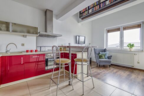 – jeden świeżo wykończony, z w pełni wyposażoną kuchnią i łazienką (ok. 38,60 m2, wys. pomieszczeń ok. 2,5 m).