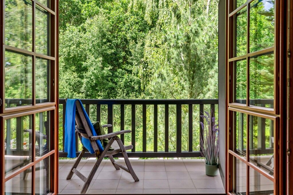 Duży taras od strony południowej zadaszony jest elektrycznie sterowaną markizą. Sprawdzi się w upalne dni.