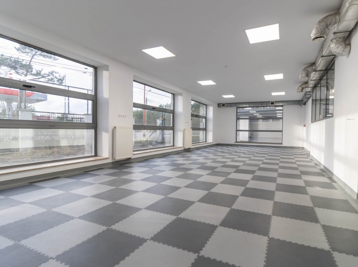 Na parterze znajduje się otwarta przestrzeń ekspozycyjna, gabinet z recepcją, pomieszczenie socjalne z kuchnią, magazyn, kotłownia oraz drugie wyjście z podjazdem od tyłu budynku.