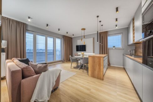 • Przestronny salon z dużymi oknami i wyjściem do ogrodu