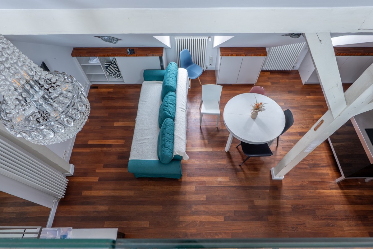 Poziom 2 – salon z aneksem kuchennym oraz antresola z dodatkową przestrzenią do spania/biura.