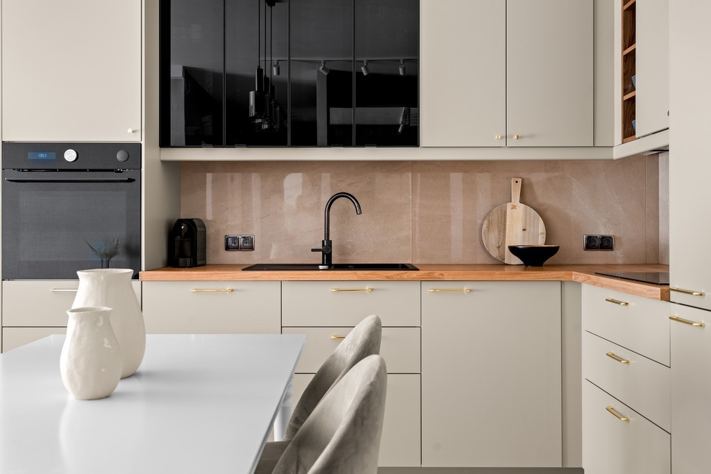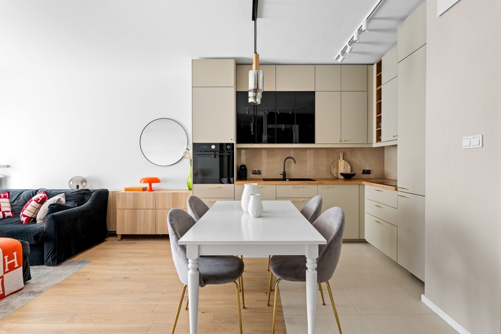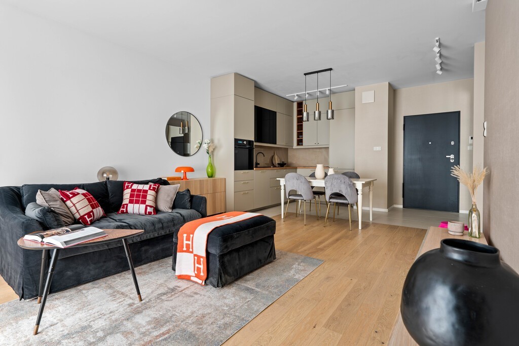 Salon z aneksem kuchennym i wyjściem na balkon- serce mieszkania, utrzymane w nowoczesnym, a zarazem przytulnym stylu. Aneks kuchenny wyposażony jest w sprzęty renomowanych marek (lodówka Samsung, piekarnik z funkcją pary, duża zmywarka 60 cm) oraz zabudowę wykonaną na wymiar, która harmonijnie wpisuje się w wystrój wnętrza.