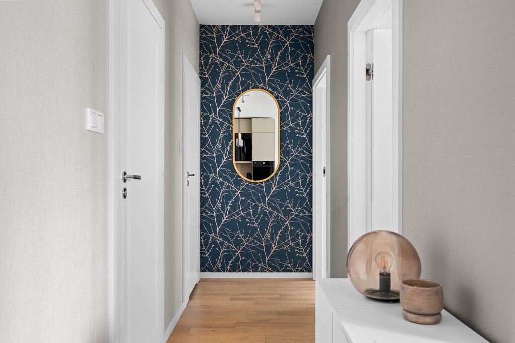 Hol z dużą, pojemną szafą- zapewnia wygodne miejsce do przechowywania i utrzymania porządku w mieszkaniu.