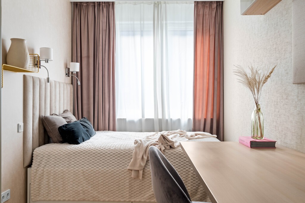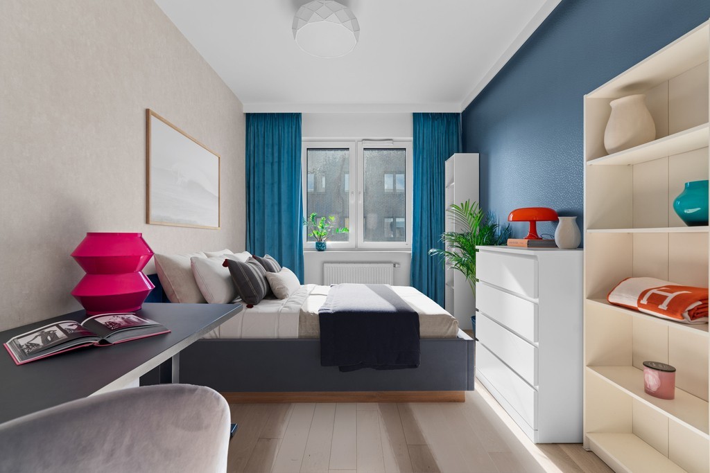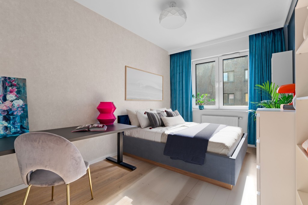 Dwie sypialnie, ustawne, z możliwością dowolnej aranżacji. Jedna z nich może pełnić funkcję sypialni głównej, druga, pokoju dziecięcego, gabinetu lub pokoju gościnnego.