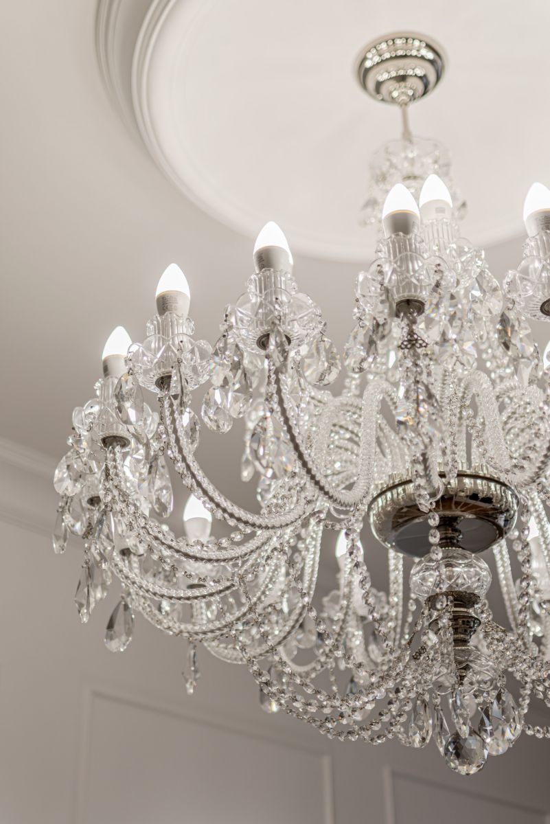 - imponujący, kryształowy żyrandol Bohemia jako artystyczny akcent w salonie, całe oświetlenie w salonie jest z kolekcji Crystal Art.