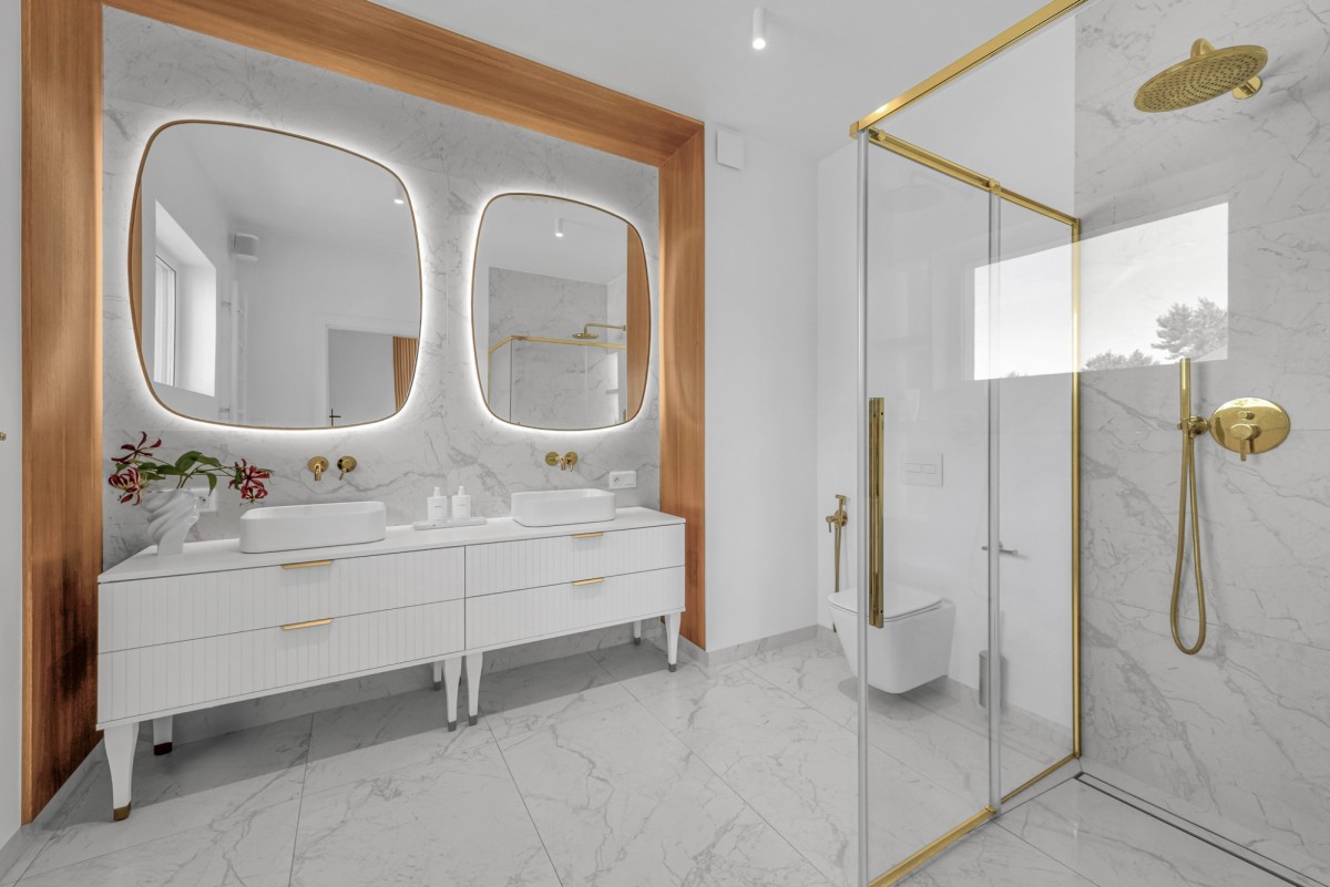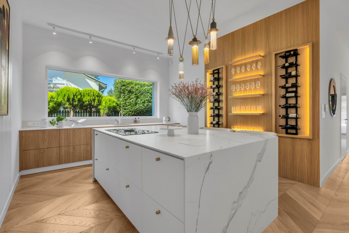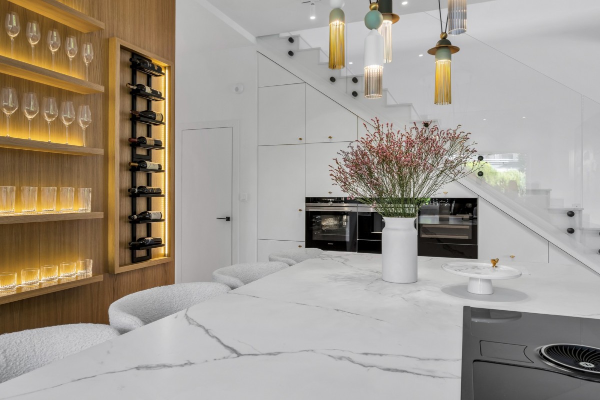 Dom wykończony został w bardzo wysokim standardzie, z użyciem materiałów i wyposażenia renomowanych marek. Projekt wnętrz to połączenie światowego designu z funkcjonalnym podejściem do przestrzeni – elegancko, nowocześnie, z przemyślanym układem i wyjątkową atmosferą.