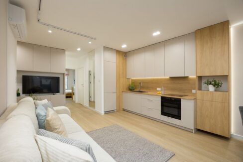 Ta kondygnacja stanowi część dzienną domu. Znajduje się tutaj duży salon, który składa się z części jadalnianej oraz części wypoczynkowej. Dużym atutem tego pomieszczenia jest również duży taras. Po przeciwnej stronie domu znajduje się w pełni wyposażona kuchnia (również z tarasem). Oprócz tego, na piętrze znajduje się duży gabinet oraz łazienka z wanną.