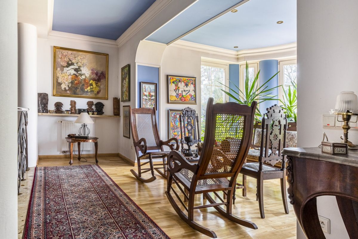 Niezwykły dom z 6 przestronnymi pokojami do wynajęcia. Przedpokoje i korytarze zdobią kąciki relaksacyjne z roślinami, podkreślające wyjątkowy styl wnętrza.