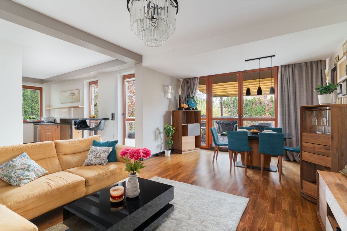 Salon z otwartą kuchnią, wyjściem na duży taras oraz zaciszny ogródek o powierzchni 300m²