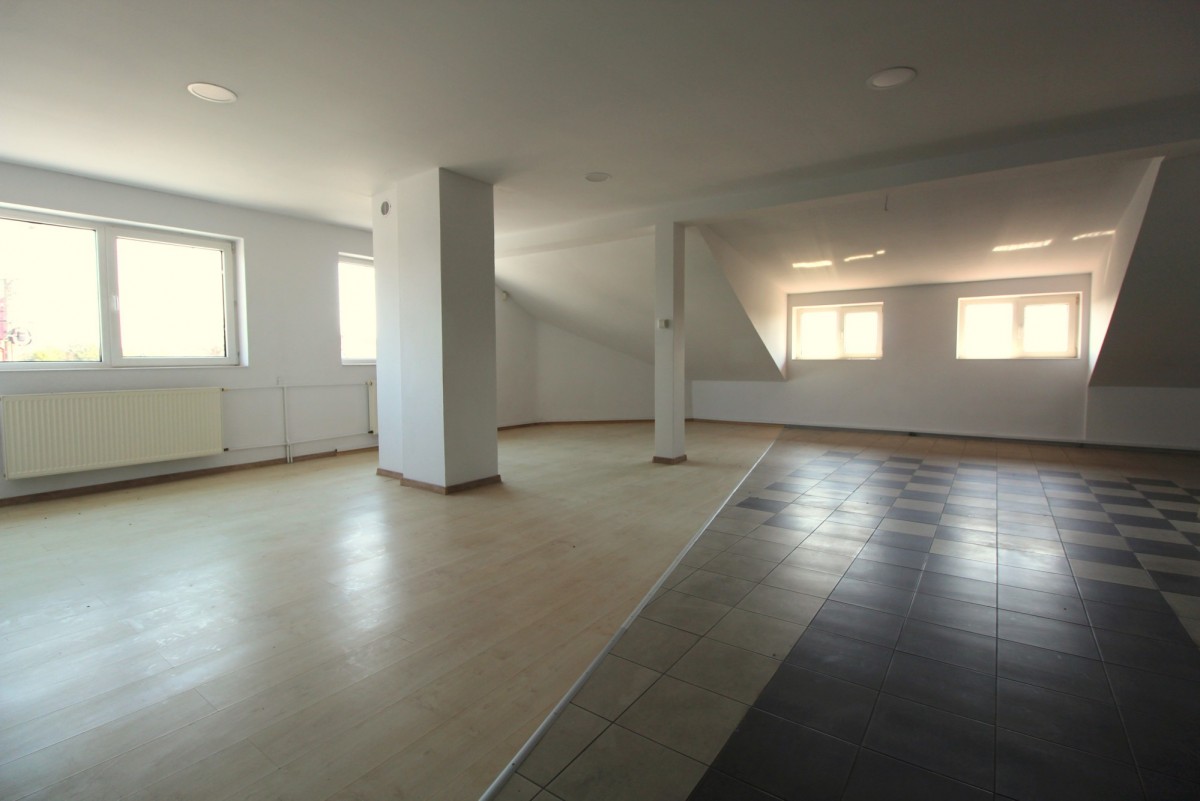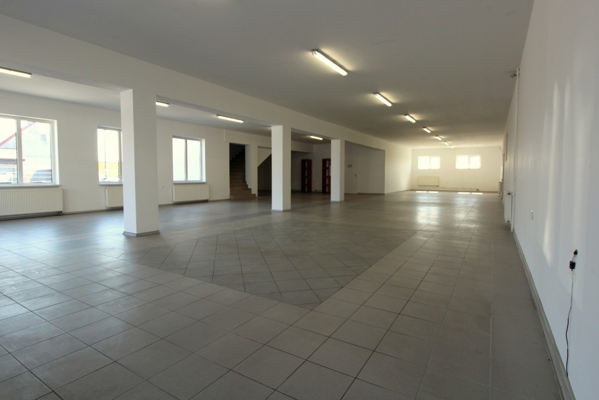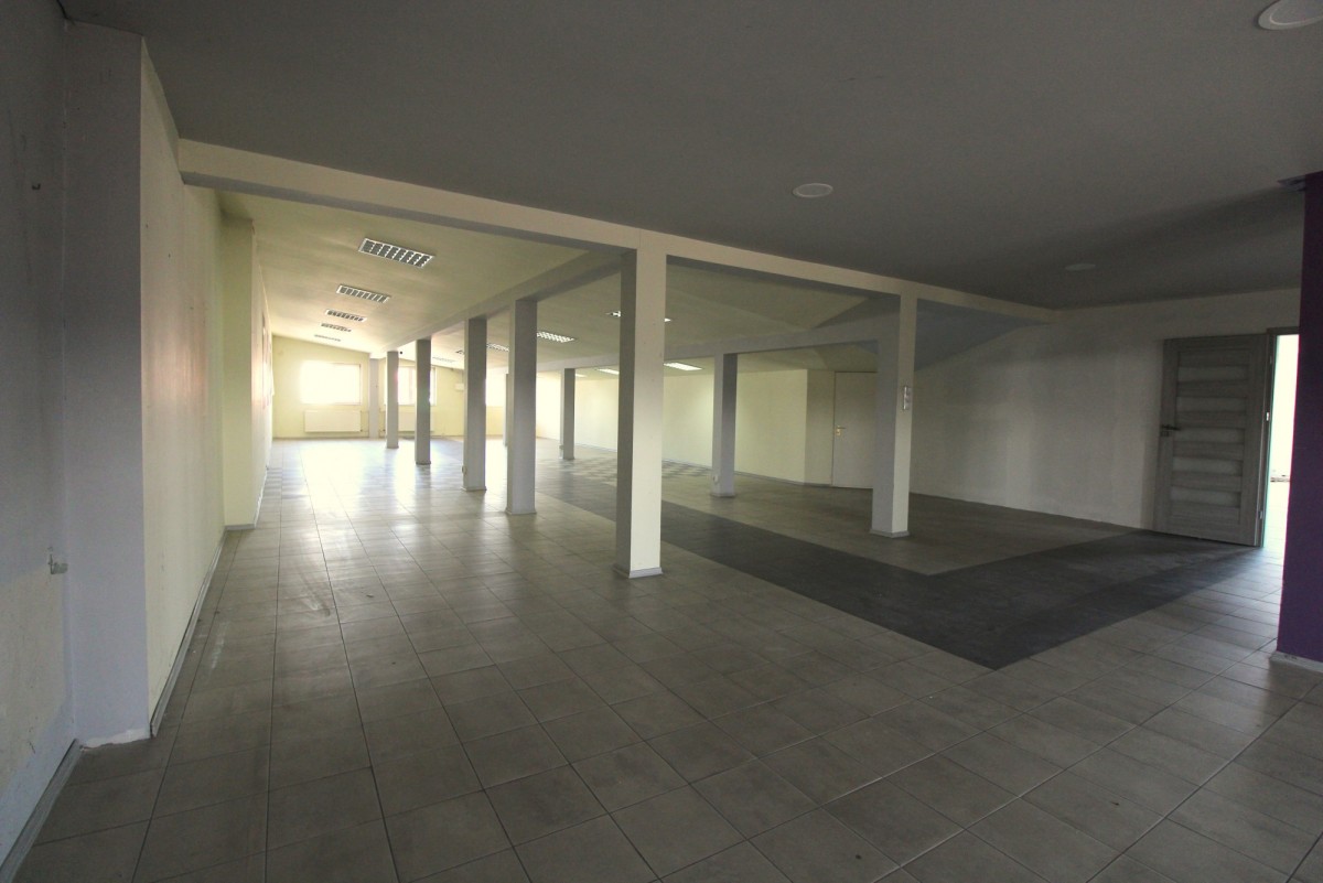 Przedmiotem najmu jest odrębny budynek handlowo-produkcyjny składający się z parteru i użytkowego poddasza, pomieszczeń biurowych i zaplecza magazynowego. Na Parterze: sala handlowo-wystawowa o łącznej pow. ok. 300 m2, pomieszczenie biurowe, pomieszczenie socjalne, magazyn – 3 m wysokości. Na piętrze sala open space o pow. ok. 100 m2, pomieszczenie biurowe, archiwum – sufit ze skosami o wysokości 1,2m-2,6 m. Stan dobry, na podłodze terakota na ścianach GK i Gipsy – do własnej aranżacji przez Najemcę bez dużych nakładów finansowych. Obiekt posiada alarm i system kamer zewnętrznych. Budynek obecnie ogrzewany piecem olejowym, przy czym doprowadzona jest też instalacja do montażu pieca gazowego. Budynek świetnie sprawdzi się jako sklep specjalistyczny z usługami (sklep, magazyn), mały zakład produkcyjny (poligrafia, szfalnia itp.)