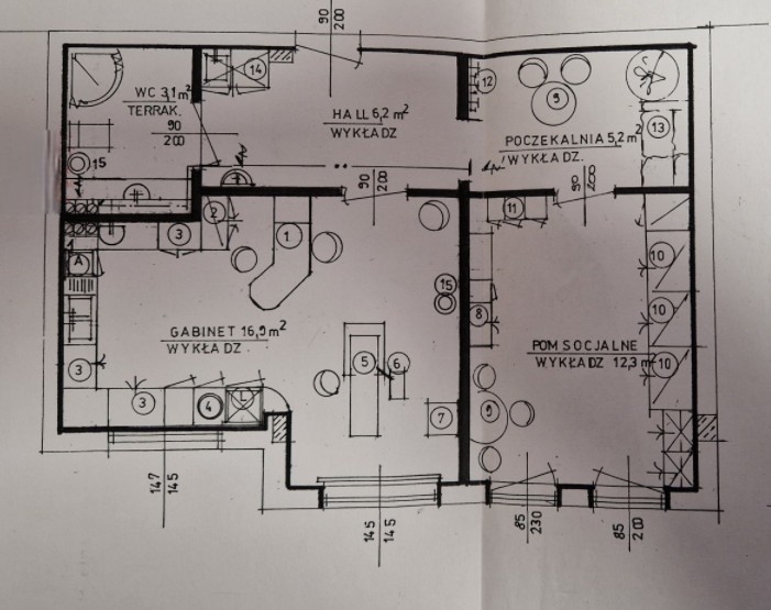 - gabinetu głównego o pow. 17 m² z fotelem i unitem stomatologicznym oraz zapleczem pomocniczo-socjalnym (szafki z blatem roboczym),