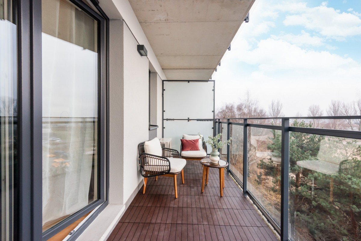 To słoneczne wnętrze z widokiem na zieleń, zapewniające poczucie prywatności i spokoju, idealne do komfortowego życia.
