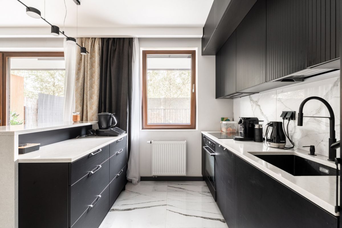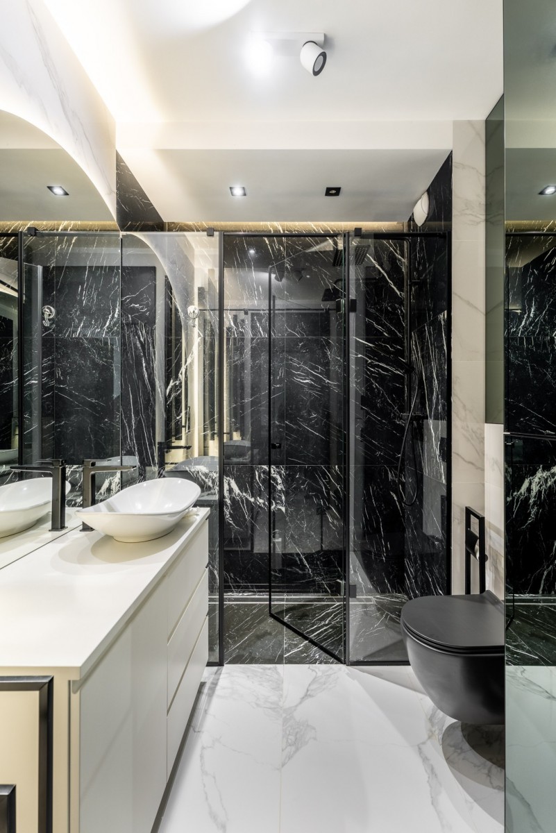 Uwagę przyciągają wysokiej jakości materiały – drewno oraz wykończenia w stylu marmuru, które nadają przestrzeni szlachetności. Przemyślana, oszczędna w dekoracje aranżacja sprawia, że mieszkanie jest niezwykle przestronne i uporządkowane.