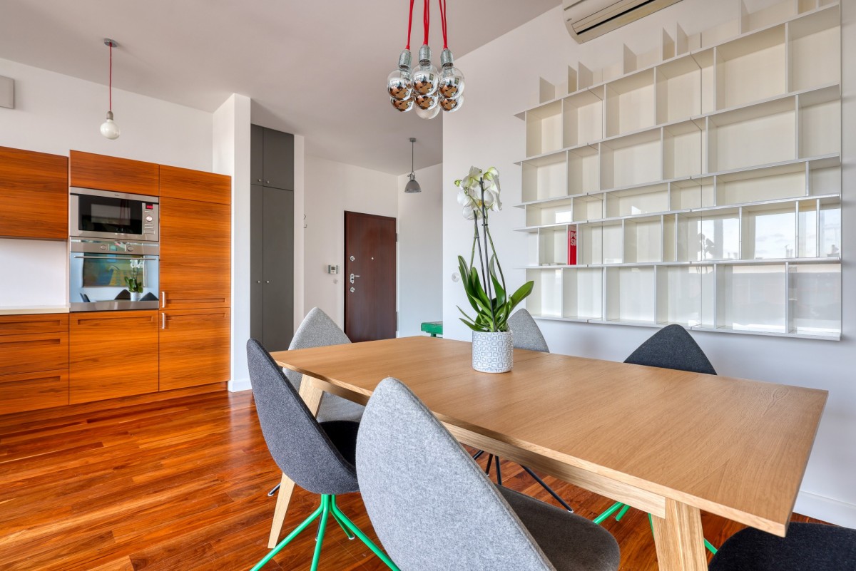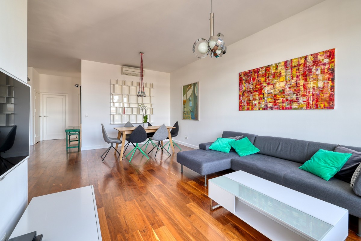 - Spacious, beautiful living room with custom-built kitchen, dedicated dining area, and direct access to a terrace with Vistula River view