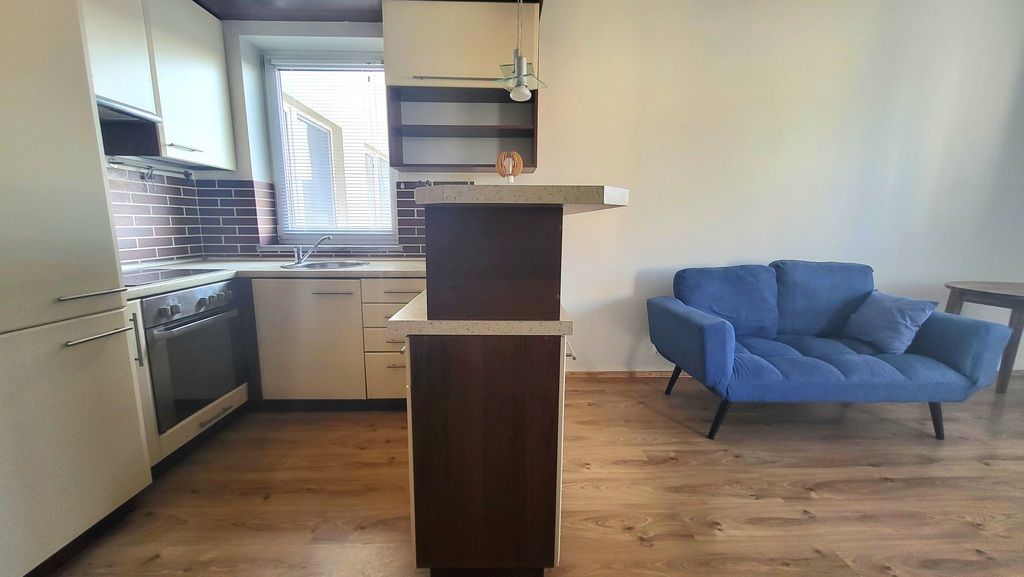 Salon z aneksem kuchennym — jasna, wygodna przestrzeń dzienna z wyposażeniem kuchennym (piekarnik, płyta, lodówka),