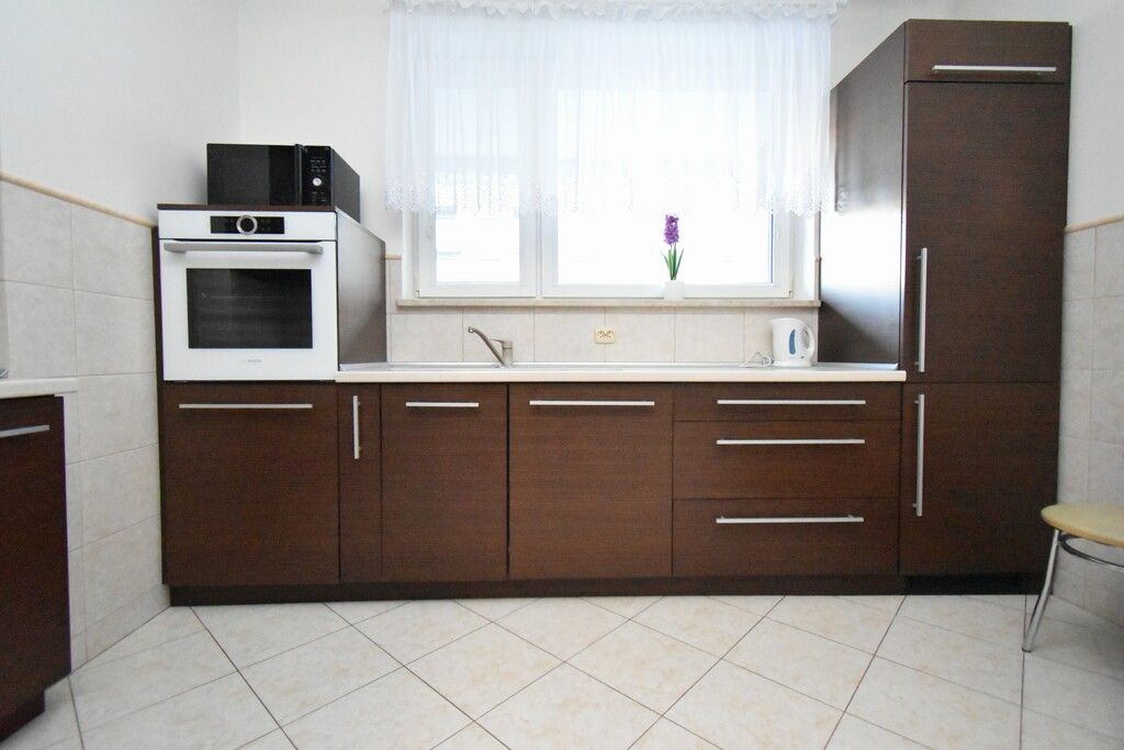 - Oddzielnej Kuchni: Nowoczesna zabudowa w ciemnym drewnie, wyposażona w niezbędny sprzęt AGD (piekarnik, płyta, zlew pod oknem, zmywarka, duża lodówka w zabudowie).