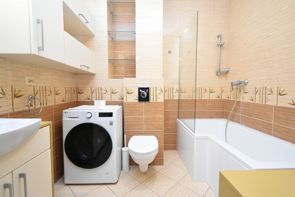- Łazienki: Komfortowa i czysta, z dużą wanną z parawanem (funkcja prysznica), pralką oraz dużą ilością miejsca do przechowywania.