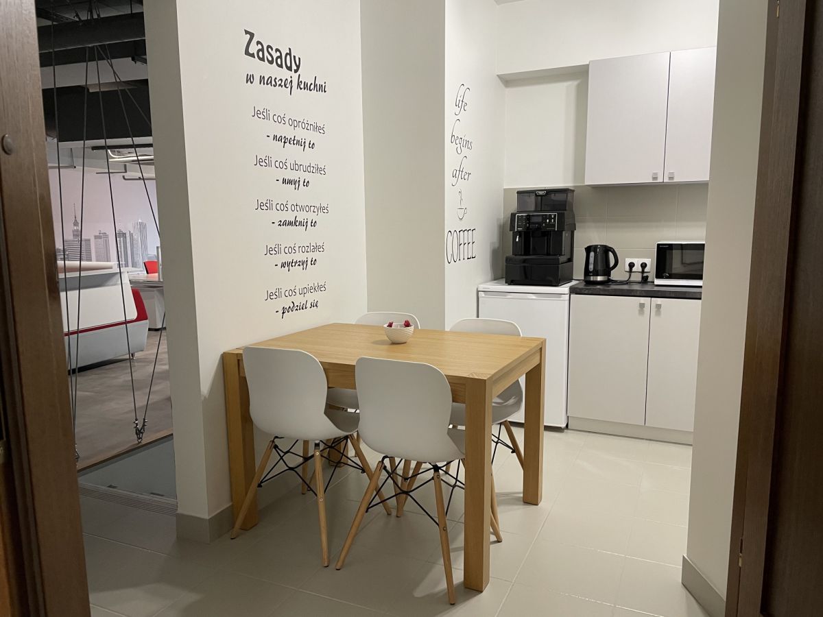 Nowocześnie wykończony i w pełni wyposażony lokal biurowy; recepcja oraz open space (razem 50 m2), open space #2 (50 m2), pokój (25 m2) z możliwością podziału na 2 mniejsze, i sala konferencyjna (20 m2). Dodatkowo serwerownia, kuchnia, WC. Możliwy przydział mocy do 40kW.
