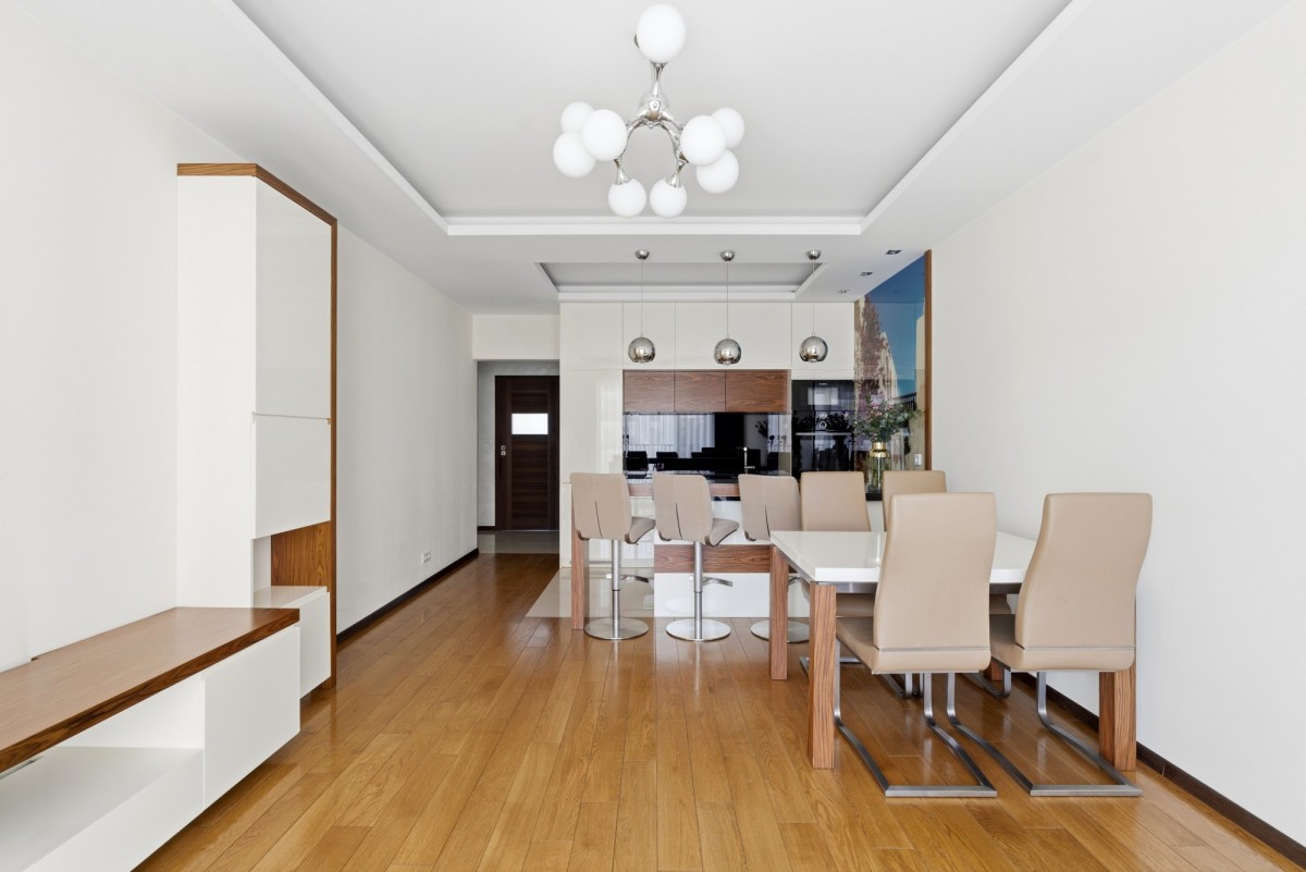 Mieszkanie wykończone w wysokim standardzie, w stanie niemal idealnym. Drewniane podłogi, granitowy blat w kuchni, zabudowy stolarskie i meble wysokiej jakości tworzą elegancką i ponadczasową aranżację wnętrza. Całość utrzymana w nowoczesnym, i eleganckim stylu.