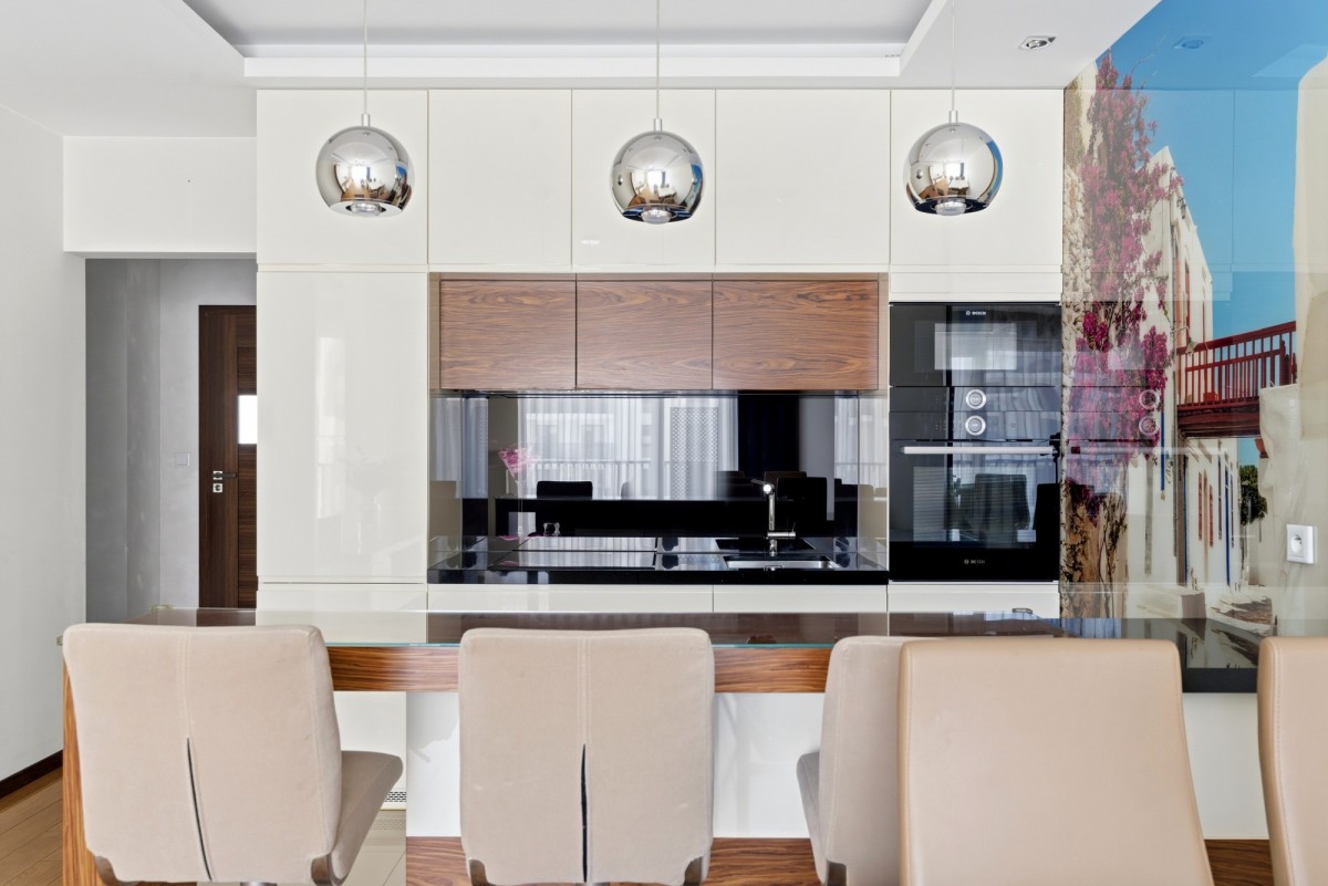 Salon z kuchnią – zabudowa meblowa na wymiar (materiały wysokiej jakości – fronty lakierowane ze znaczą częścią z forniru, blaty granitowe pogrubiane). Aneks kuchenny wyposażony w sprzęty AGD marki BOSH.