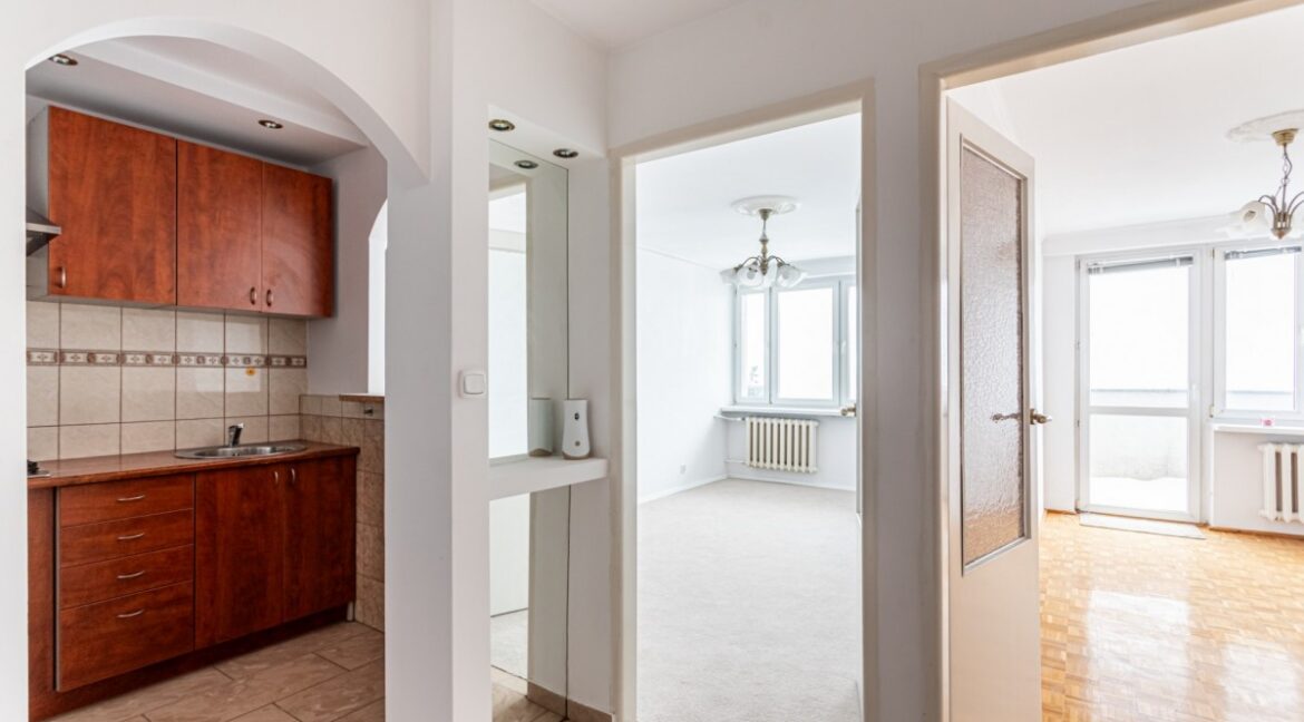 Mieszkanie o powierzchni 38,24m2 usytuowane na XIII piętrze. Składa się z: pokoju dziennego z półotwartą kuchnią, sypialni z wyjściem na niewielki balkon, łazienki oraz przedpokoju. Lokal w stanie do remontu. Okna wychodzą w kierunku zachodnim, na centrum Warszawy. Mieszkanie znajduje się w charakterystycznym, szesnastopiętrowym punktowcu, wzniesionym w latach 70. (1971-1973) w ramach powojennego zagospodarowania terenu na Powiślu….