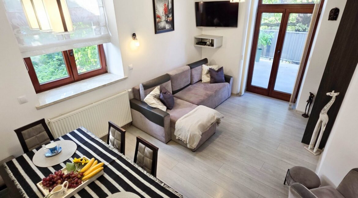 Powierzchnia: 51 m² + komórka lokatorska 10 m² z oknem Tarasy: dwa prywatne – 20 m² i 4 m² z drewnianymi drzwiami tarasowymi Piętro: II – tylko 10 apartamentów w całym budynku Wysokie wnętrza: około 3 m – urzekające poczucie przestrzeni i światła Ekspozycja: dwustronna – słońce o każdej porze dnia, urzekający widok na zieleń…